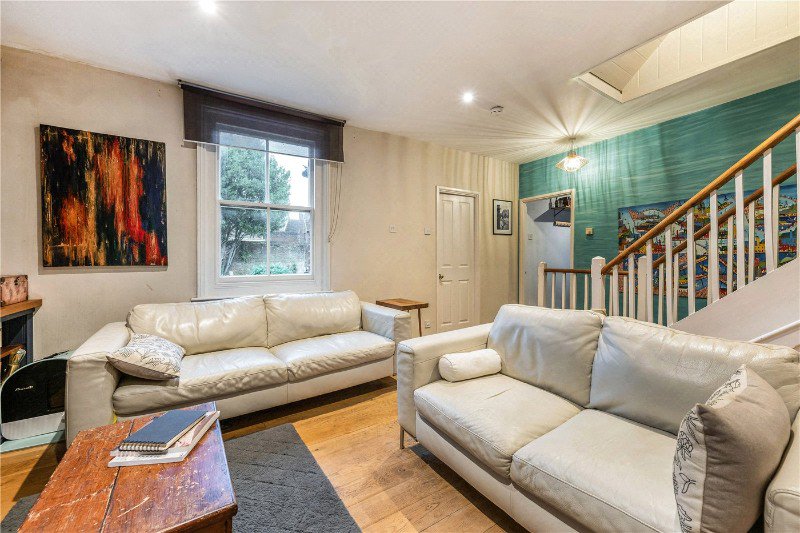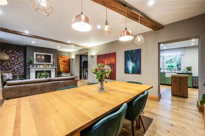 Behind its handsome Georgian façade, the ground floor opens into an impressive, broad sitting and dining area. This space forms the social core of the house; a striking open-plan room with exposed beams, warm timber floors and zones that flow seamlessly from relaxed seating to formal dining. The front windows draw in natural light and highlight the room’s contemporary finishes, while still preserving the charm of the architecture. Beyond this, a snug provides an intimate additional living area, ideal as a reading room, playroom or quiet retreat, opening onto the rear garden.