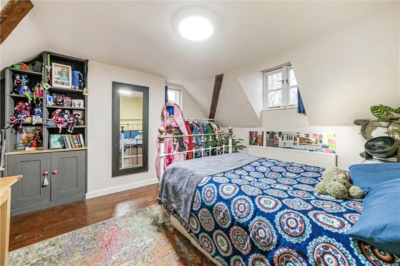 The first floor offers superb family accommodation, featuring a generous family room, three bedrooms and a decently proportioned family bathroom. Bedroom one is particularly notable for its scale and light, creating a wonderfully inviting principal sleeping space and offering a stylish en suite and built in wardrobes. The second floor provides two further double bedrooms, both with characterful dormers, exposed beams and good proportions. A large cupboard and eaves storage complete this level.