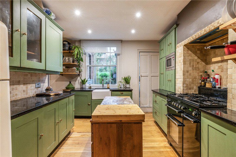 The kitchen, positioned toward the back of the house, exudes a classic country style with sleek green cabinetry, granite worktops and a butler sink framed by views over the garden. A central island adds convenience and dimension to the space, while the sizeable range cooker sits neatly within an attractive tiled surround. A separate utility room and ground floor cloakroom enhance the practicality of the layout.