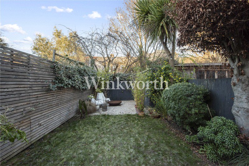 The private rear garden measures approximately 33 ft x 14 ft and is a standout feature of the home. A light buff brick patio leads directly from the extension, perfect for entertaining, while a striking mature palm tree provides a strong focal point. Despite its north-facing aspect, the garden enjoys excellent sunshine from March through September and is fully equipped with lighting, power and water.