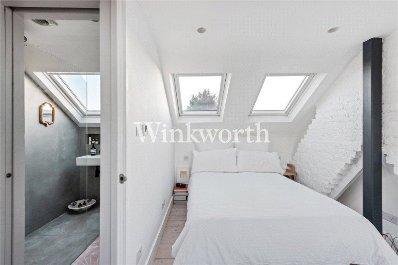 The loft conversion provides a generous third bedroom, flooded with natural light from a bespoke rooflight, two opening Velux windows and a full-width window. This serene retreat includes built-in wardrobes, extensive eaves storage and a Victorian-style radiator. A second bathroom on this level mirrors the exceptional quality found throughout the home, with underfloor heating, walk-in shower with microcement finishes, handcrafted cement tiles and an opening Velux window.