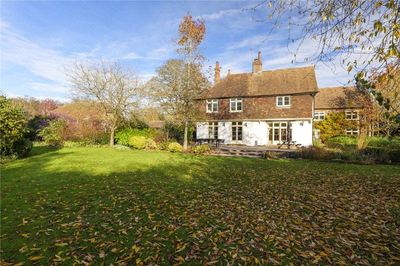 The facade is an elegant blend of exposed repointed brickwork, and a Kent peg tile roof. Carefully maintained windows frame a handsome front door that sits centrally within the front elevation, creating a balanced and inviting appearance.