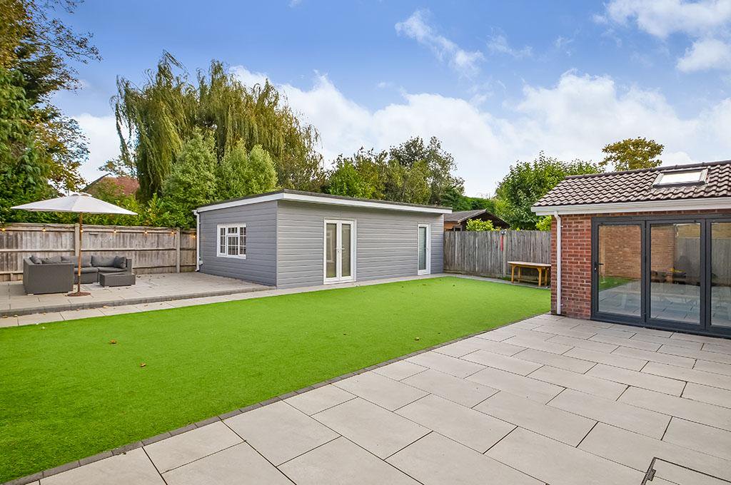The garden is fully enclosed with a good degree of privacy. There are two large patios, one adjoining the house and accessed from the dining area, and another adjoining the detached weatherboarded garden studio. An Astroturf lawn ensures easy maintenance.