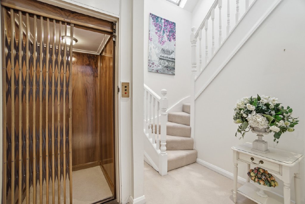 Spanning three generously proportioned floors, serviced by both stairs and a rare original 1950s elevator, the accommodation has been thoughtfully configured for modern family life. Five double bedrooms, each with its own en-suite bathroom, deliver a level of comfort and independence that transforms daily living.