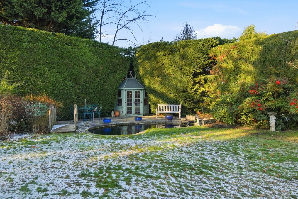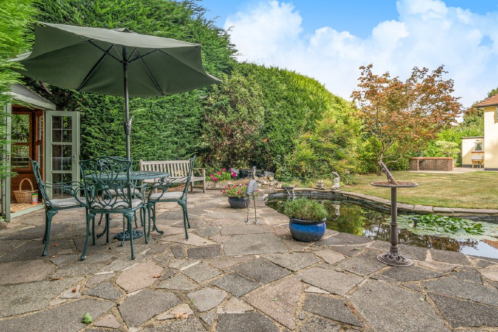 Step outside and the westerly aspect truly shines. The mature landscaped garden is a genuine asset, deep enough for children to lose themselves in play, yet sophisticated enough for adult entertaining. A thoughtfully designed koi pond adds a tranquil focal point, its gentle movement and graceful fish creating a sense of serenity. The expansive terrace, accessible directly from the main living spaces, becomes an extension of the home in warmer months: al fresco dining, summer drinks, lazy Sunday afternoons.