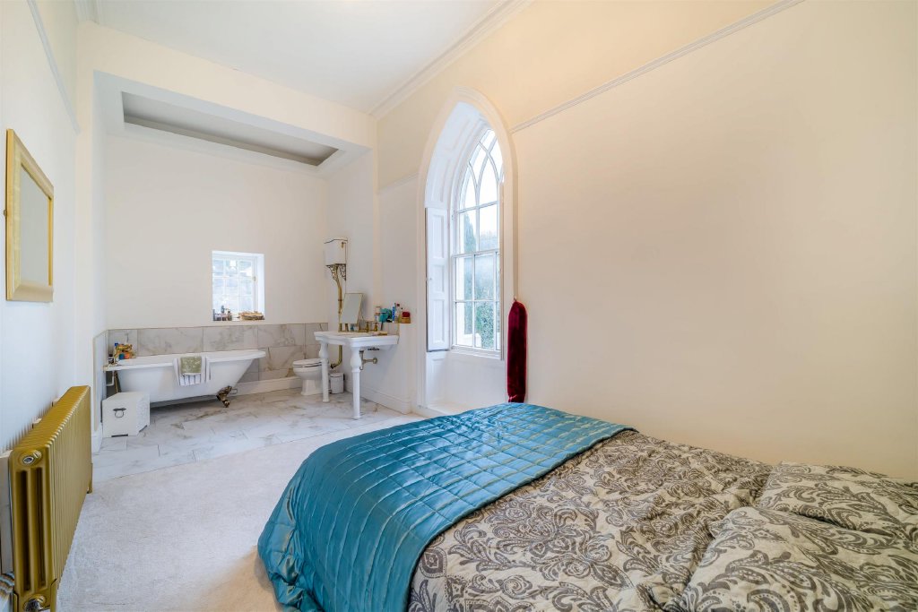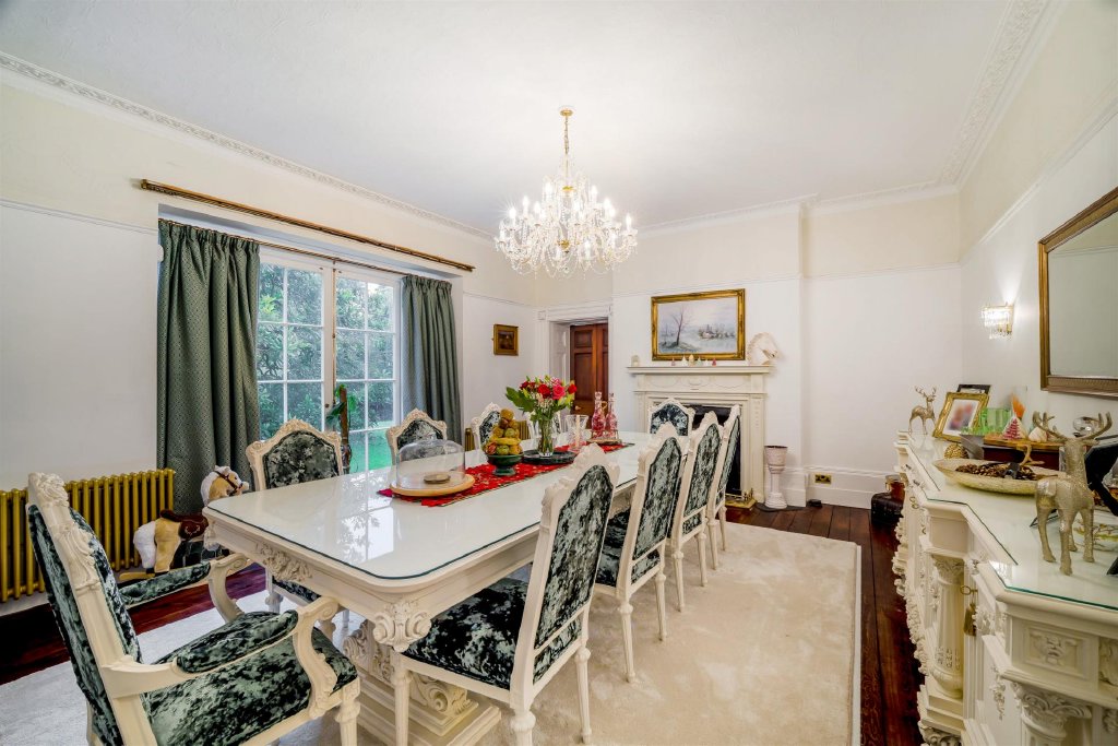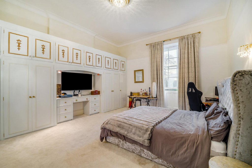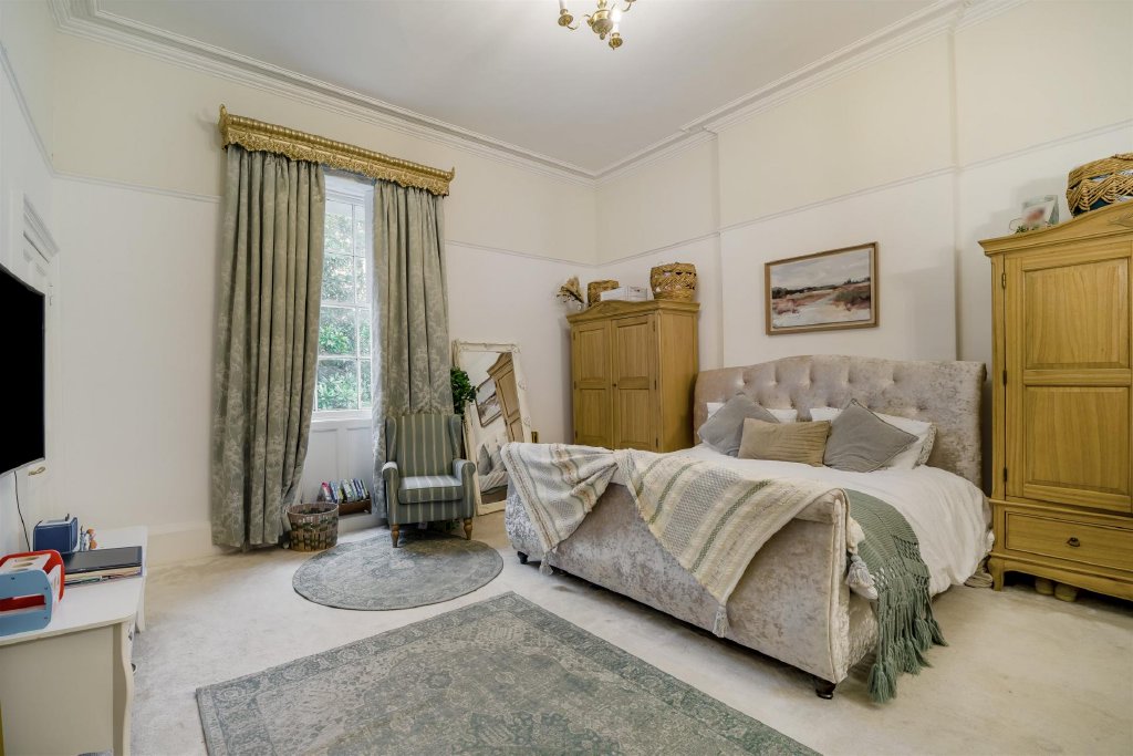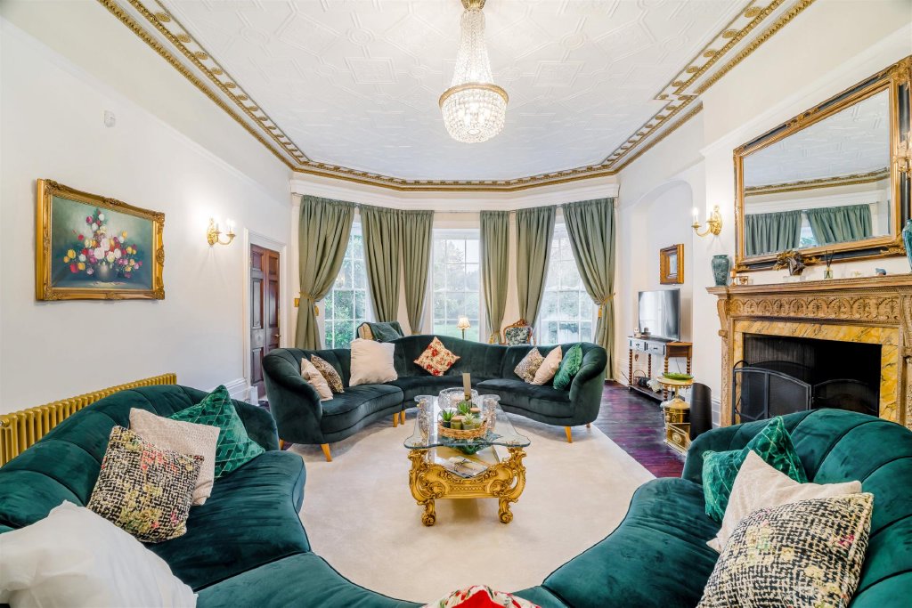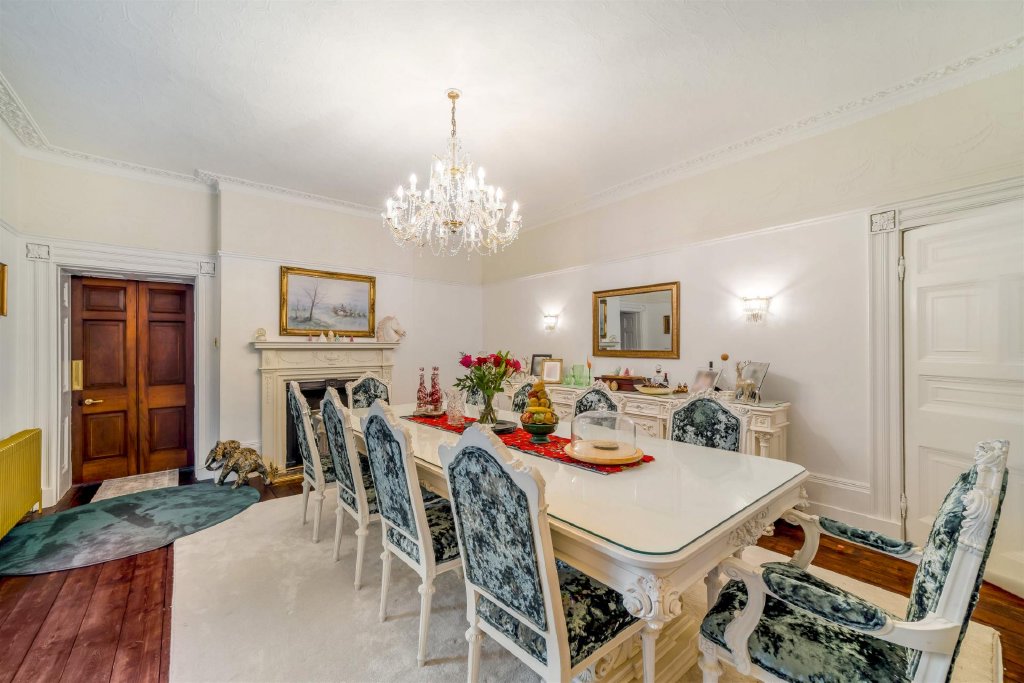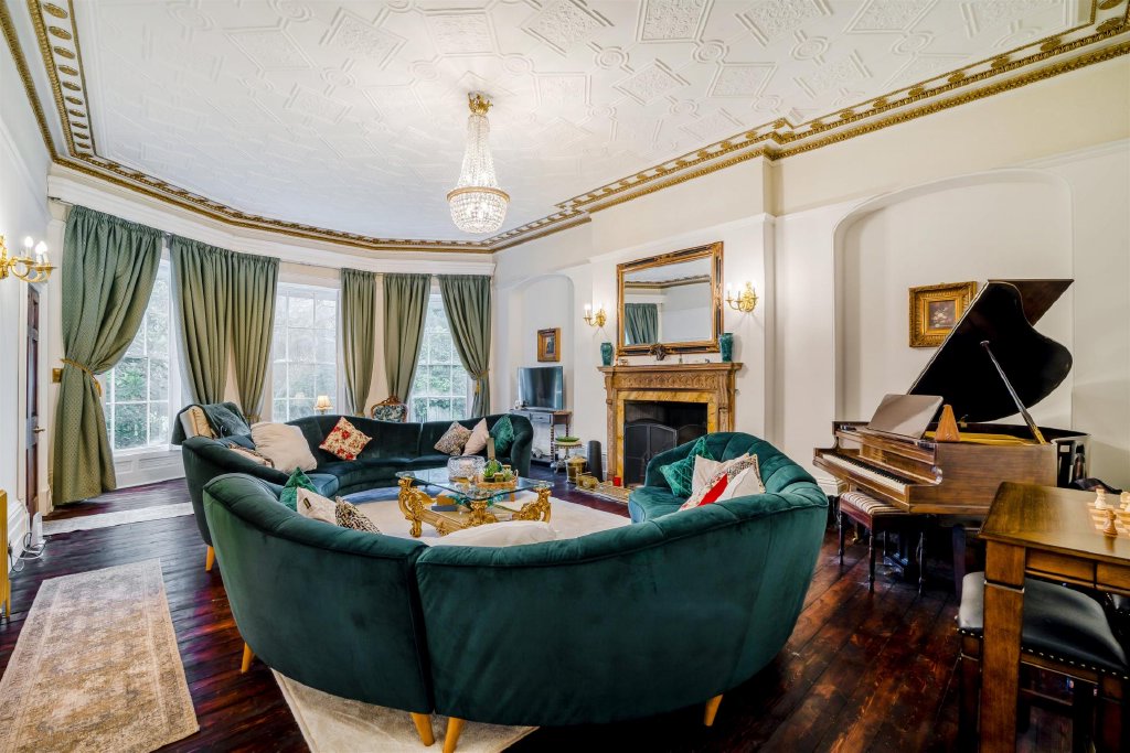 The principal house is arranged around an impressive central hall, with tall sash windows, generous ceiling heights and original fireplaces contributing to the classic Georgian feel. The reception rooms are gracefully proportioned, creating spaces that are ideally suited to both formal entertaining and day-to-day family living, with natural light and garden outlooks enhancing the sense of privacy and calm.