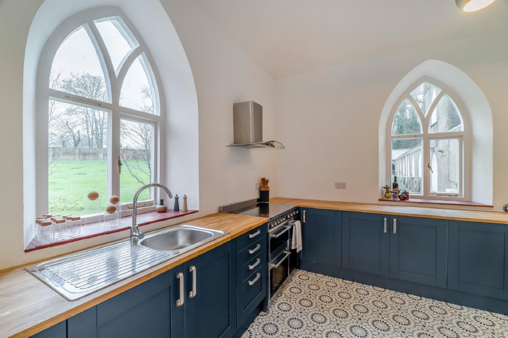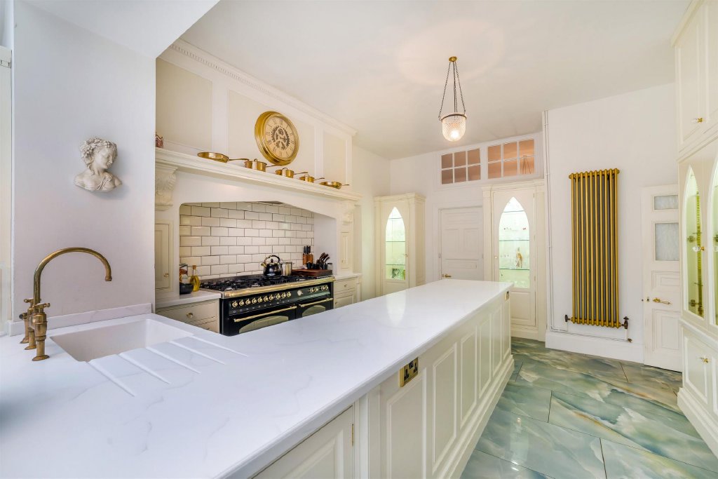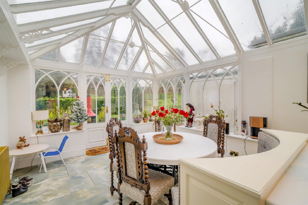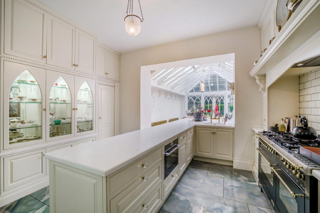 At the heart of the home, the kitchen has been sympathetically renovated with a handcrafted Clive Christian design, offering timeless cabinetry and fine detailing befitting the building's period character. This space flows through into a light-filled orangery, providing year-round enjoyment of the gardens and an elegant informal living or dining area.