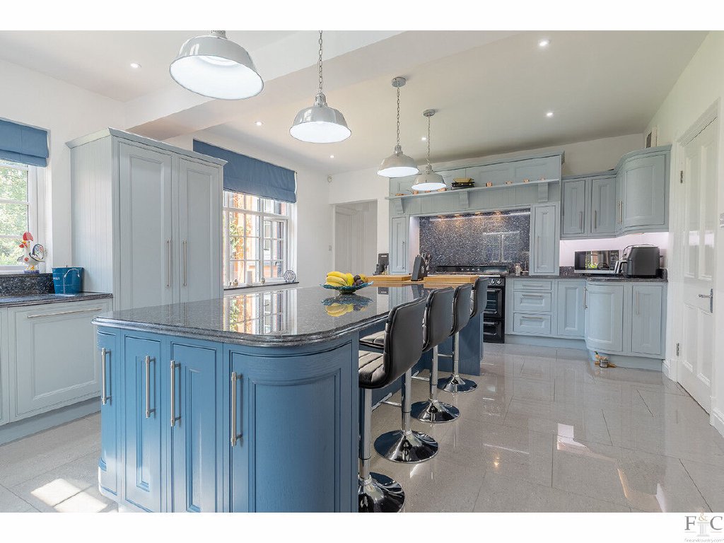 The heart of the house is often said to be the kitchen and here the kitchen is central within the home and beautifully designed. Ample storage and display space is provided by Shaker style cabinetry in contrasting cornflower blue and old navy accessorised with temporary brushed steel bar handles. Integrated appliances include a Miele dishwasher and an imposing black SMEG oven sits within a recessed, bespoke unit with high mantel shelf and flanked by side cupboards, reminiscent of a kitchen range. Above the seven-burner gas hob, a Bosch canopy extractor fan ensures ventilation, with two fan-assisted electric ovens and a separate grill completing the cooking facilities. The oven has a black and grey speckled splash back and matches the granite worktops above the central island unit and running under the wall units. Four pendant Hager industrial lighting fixtures hang above the island, and it provides the perfect location for breakfast or a coffee while admiring the views into the garden. Likewise, the position of the sink unit beneath one of the three windows permits garden gazing. Additional features include a Franke waste disposal unit, a Swiss Pro steaming hot and cold filtered water tap, two Neff refrigerators, a Neff four drawer freezer and a practical two-drawer bin cupboard discreetly housed beneath the island.