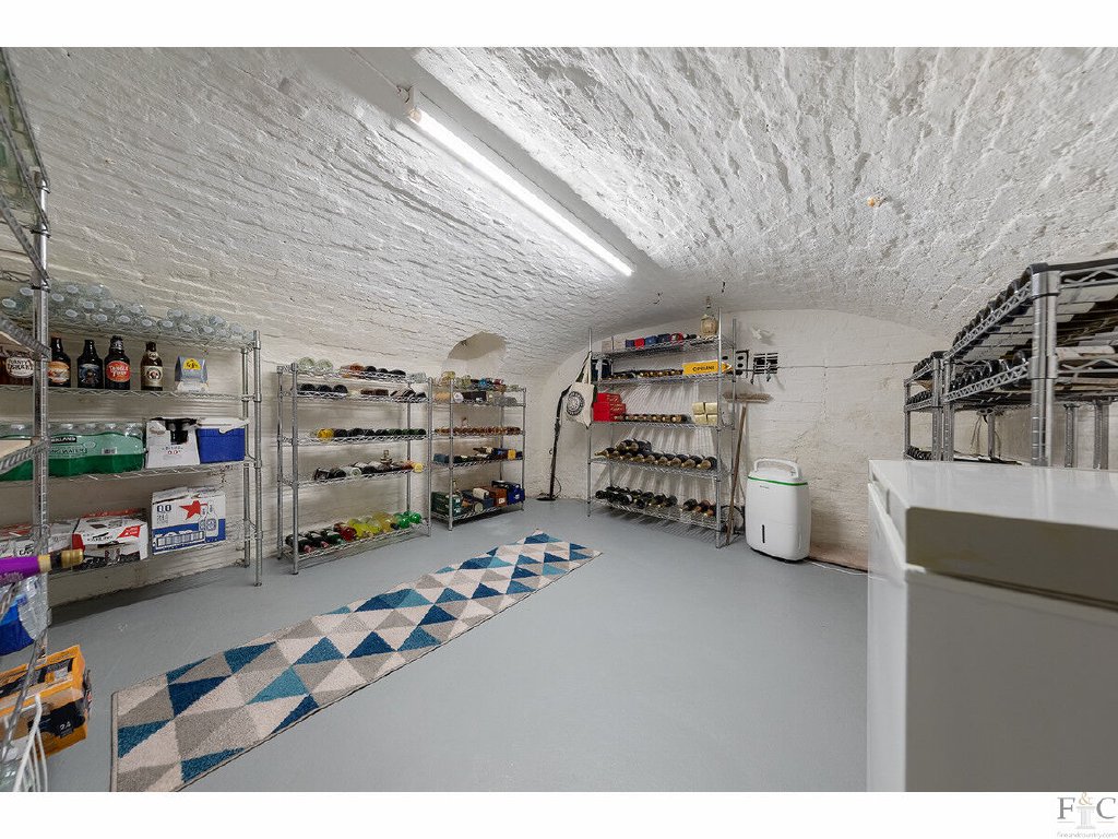 A door below the staircase leads down to the eighteen-foot square vaulted wine cellar. This is fitted with racking and strip lighting.