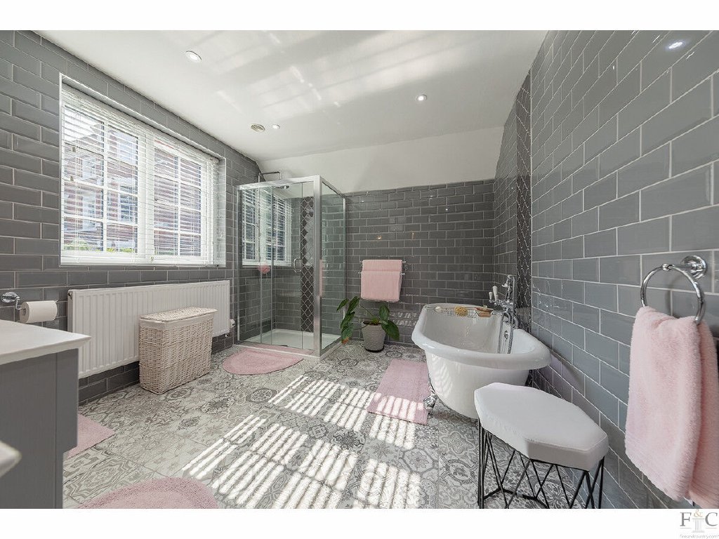 Originally the parish room, the first reception room has a large, canted bay window and fireplace, with gas fire. With dual perspectives, this spacious carpeted room has sunken ceiling lights and large windows. Next door, the lounge is similarly carpeted and has a dual fuel fire (wood or coal) within the fireplace. The study and cloakroom are at the end of the hallway. Comprising of a white two-piece toilet and basin vanity unit with contrasting chocolate brown metro tiling, the sanitary fixtures and fittings within The Old Rectory are presented and maintained to a high standard throughout. This is the first of four bathing facilities that have been supplied and equipped with stylish yet contemporary components offering fresh, luxurious ensuite shower rooms and a delightful family bathroom.