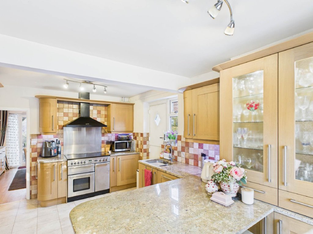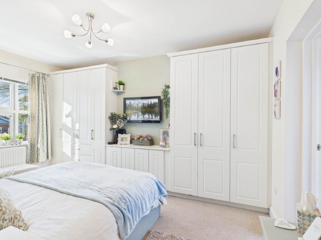The impressive modern kitchen is luxuriously fitted and forms the heart of the home, boasting a breakfast bar and a delightful window seat, ideal for relaxed family living and social gatherings. Further benefits include a welcoming entrance hall, downstairs cloakroom, ample driveway parking, and high quality fittings throughout.