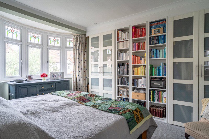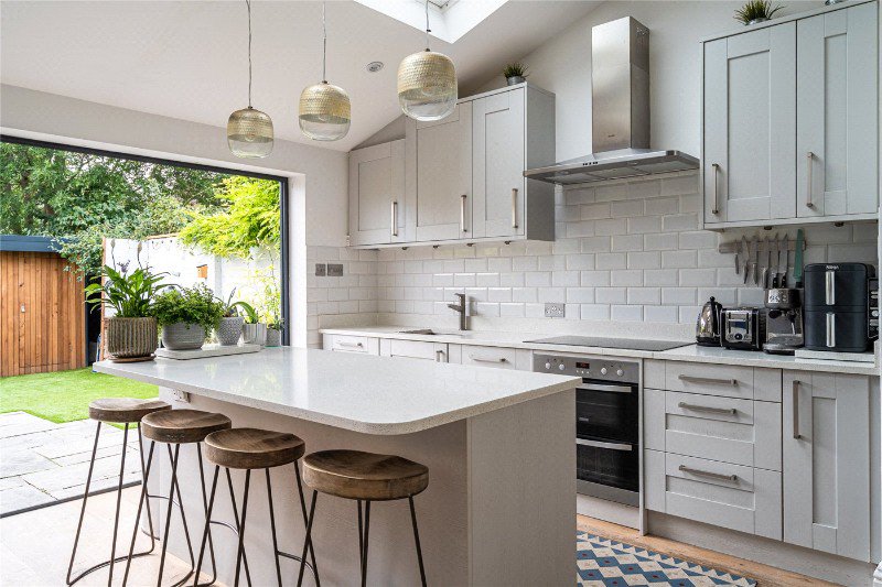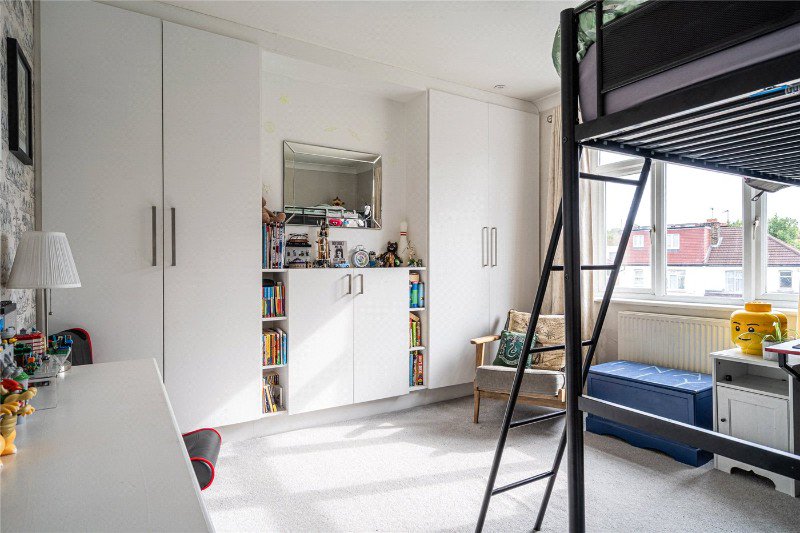 At the front, a cosy bay-fronted living room features bespoke shelving and cabinetry. The rear opens into a showpiece eat-in kitchen extension: a large island, plentiful storage and three generous roof lights bring morning sun pouring in. The rear section is dual height with a mezzanine – a brilliant play zone or extra entertaining space – while full-width bi-fold doors connect seamlessly to the garden. Built-in ceiling speakers complete the set-up for gatherings.