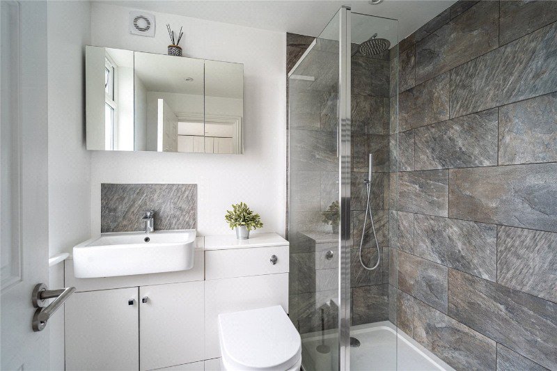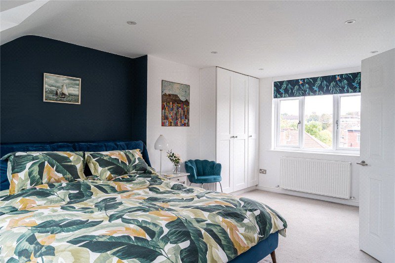 Upstairs on the first floor are three bedrooms: a generous bay-front double with fitted wardrobes and shelving, a spacious rear double with further built-ins, and a third bedroom that works well as a nursery or study. A family bathroom serves this level. The top floor is the principal suite with far-reaching city views from the front roof lights, a wall of rear glazing, fitted wardrobes, broad eaves storage running the width of the house, and an en-suite shower room.