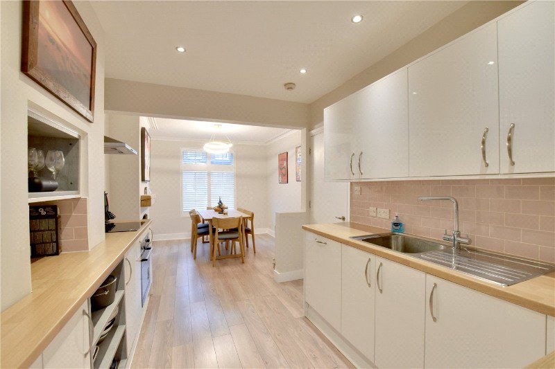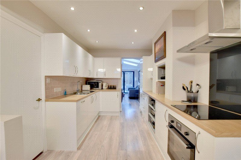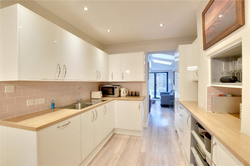 The accommodation begins with an elegant front reception room featuring bespoke window shutters, which flows seamlessly into a stylish open-plan kitchen. The kitchen is particularly well fitted, with a comprehensive range of integrated white goods and ample storage. To the rear, a fabulous extended reception provides an impressive family and entertaining space, enhanced by hardwood flooring, skylights and bi-fold doors opening directly onto the garden. A convenient guest WC completes the ground floor.