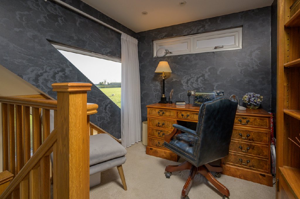 From the dining room, a bespoke oak staircase rises to a superb double bedroom enjoying breathtaking views, complemented by an en-suite cloakroom. The landing also provides access to a mezzanine study area, perfectly positioned to enjoy outlooks over the surrounding countryside.
