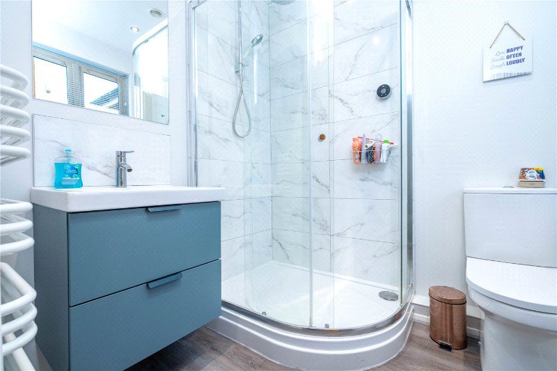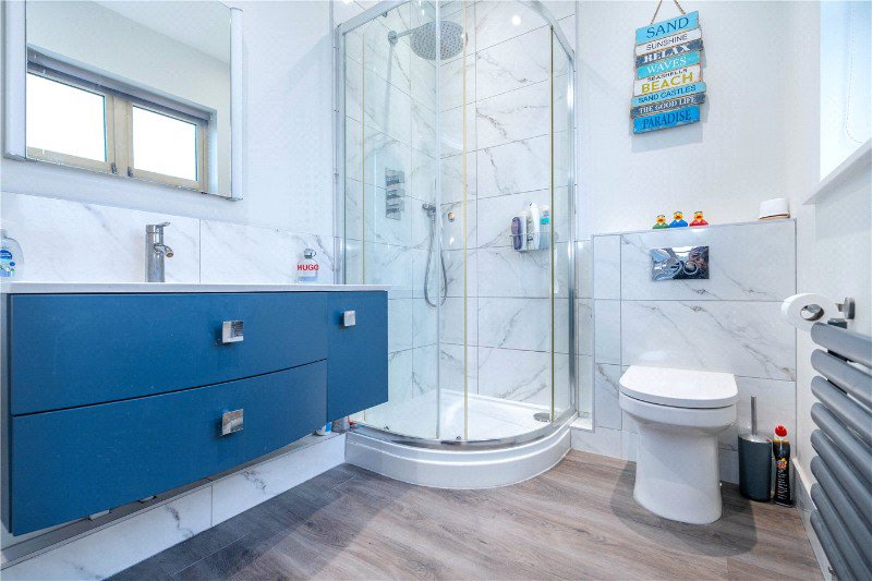With frosted UPVC window to side aspect, comprising a refitted three-piece suite, low level WC, wash hand basin set in vanity unit and corner shower, ½ tiled walls, heated towel rail, wood effect flooring and ceiling spotlights.