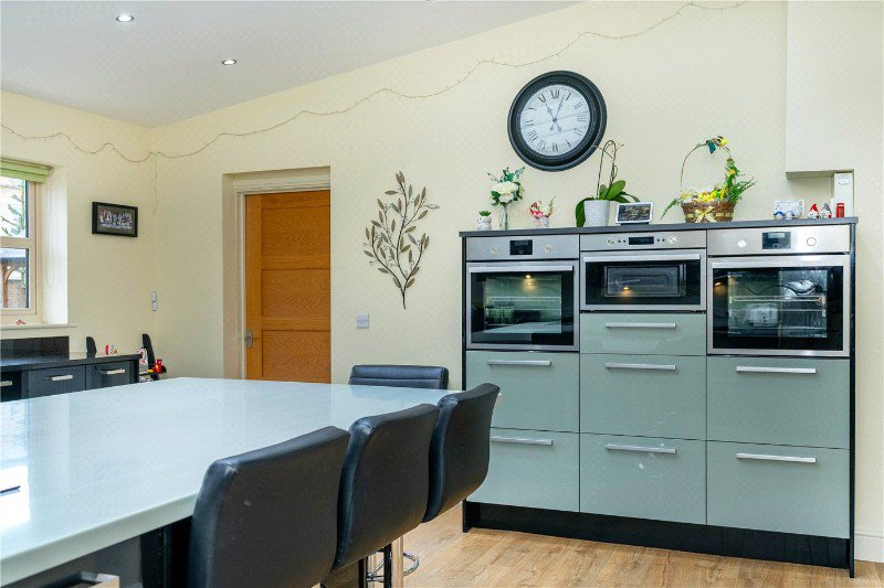 30’4 x 21’ a truly impressive space and the hub of the family home, a light room with UPVC windows to both side aspects and UPVC doors to the dual aspects, to the kitchen area the ceiling has been vaulted with three high level sky light windows, with a comprehensive range of quality contemporary high gloss base and eye level storage units with granite work surfaces and inset sink with carved granite drainer, glass splash back, large central island unit in matching high gloss with Corian work top, breakfast bar, dual integrated eye level multifunction ovens and further microwave/combination oven, integrated induction hob, integrated dishwasher, integrated recycle bins, space for American style fridge/freezer, radiators, power points, TV point and finished with wood effect flooring.