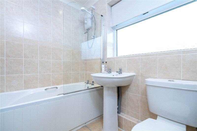 With frosted UPVC window to rear aspect, with three-piece suite with close coupled wc, pedestal wash hand basin, panelled bath with electric shower over, recessed ceiling spotlights, full height wall tiling, heated towel rail, tiled flooring