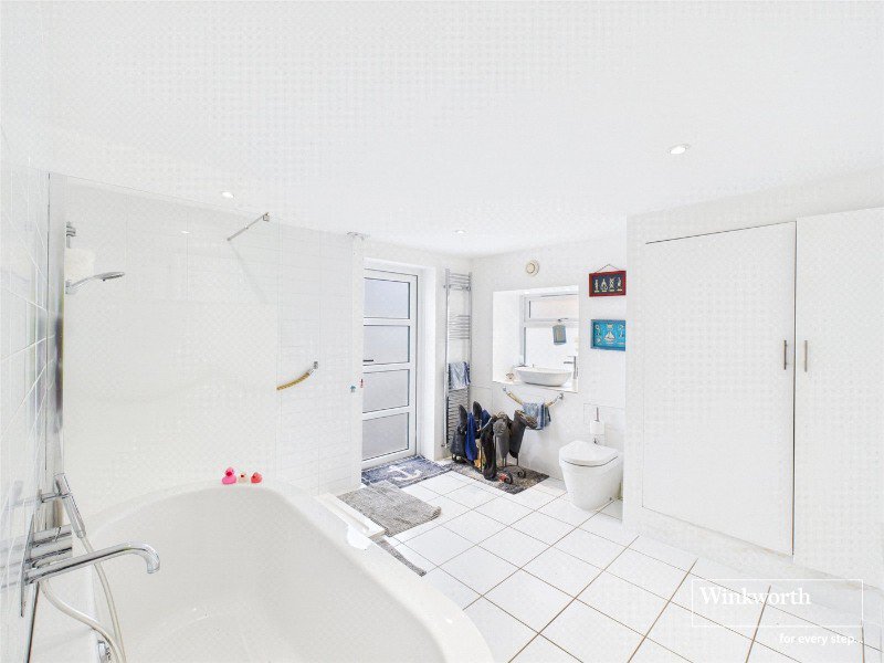 The reception room enjoys uninterrupted river views, framed by full-height glazed doors opening directly onto the rear garden. The kitchen is a standout feature, fitted with bespoke Corian and marine-grade stainless steel units on castors, and equipped with high-quality Neff and Smeg appliances. Two full-height French doors open onto the front garden, again drawing the river into view. A generous ground-floor bathroom adds both practicality and flexibility.