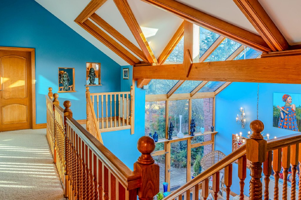 The well-manicured, extensive gardens are a highlight — thoughtfully landscaped with lawns, mature planting, and terraces that make the most of the uninterrupted countryside panoramas. A serene pond and ornate bridge adds a tranquil focal point, overlooked by a stylish breeze house that provides sheltered seating for up to 10 people.