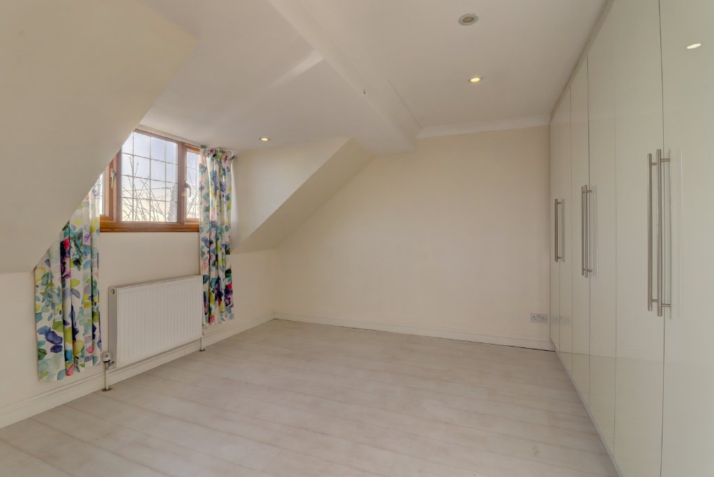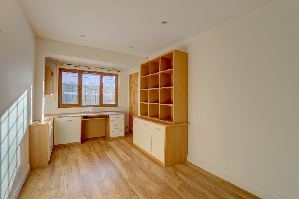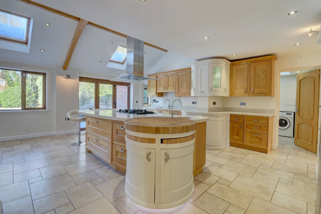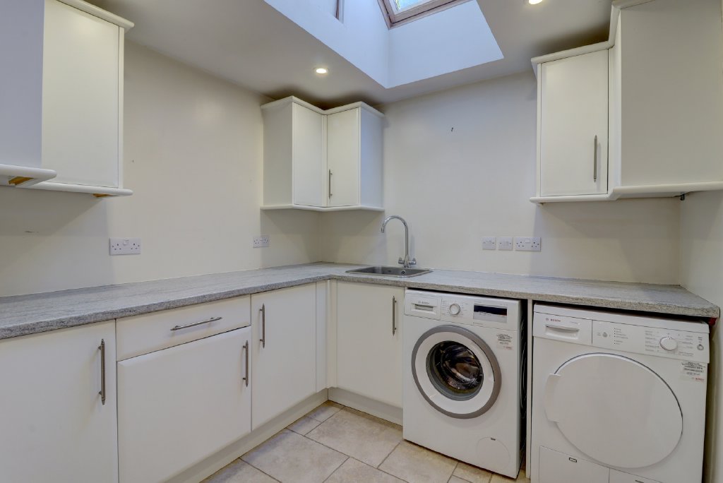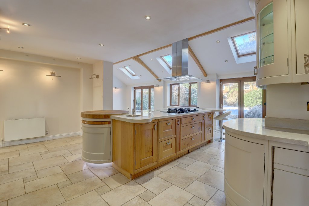 This impressive space is fitted with a range of European Oak cabinetry, integrated appliances and a large central island with hob and extractor. Bathed in natural light from Velux roof windows, the room opens onto the garden via two sets of doors, creating a wonderful connection between indoor and outdoor living. Beyond the kitchen lies a further rear aspect study and a well-appointed utility room, adding to the home’s excellent practicality. Additional benefits include a centralised water softening system and a fully integrated alarm system.