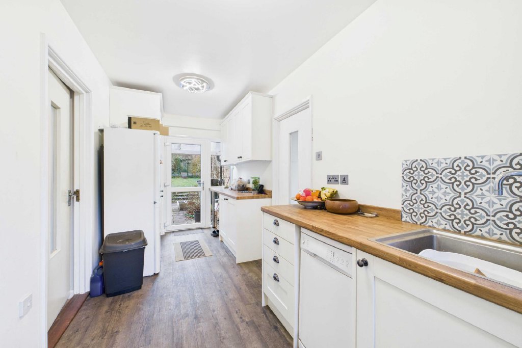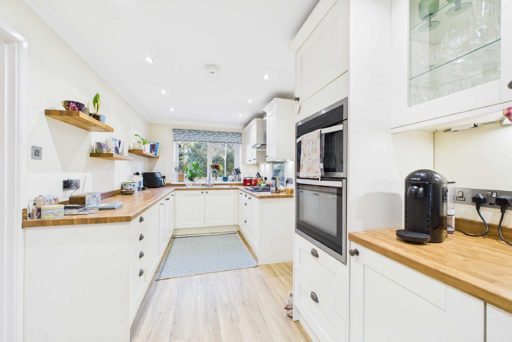 KITCHEN 15' 8" x 7' 10" (4.79m x 2.41m) Well fitted with extensive range of shaker style matching wall and floor cupboard units with works surfaces over incorporating single drainer one and a half bowl stainless steel sink unit with mixer tap; built-in electric double oven and integrated under-counter larder fridge. Integrated Calor (LPG) four burner hob with glass splash-back and extractor hood over; UPVC sealed unit double glazed window to front aspect; LVT flooring. Door leading to: