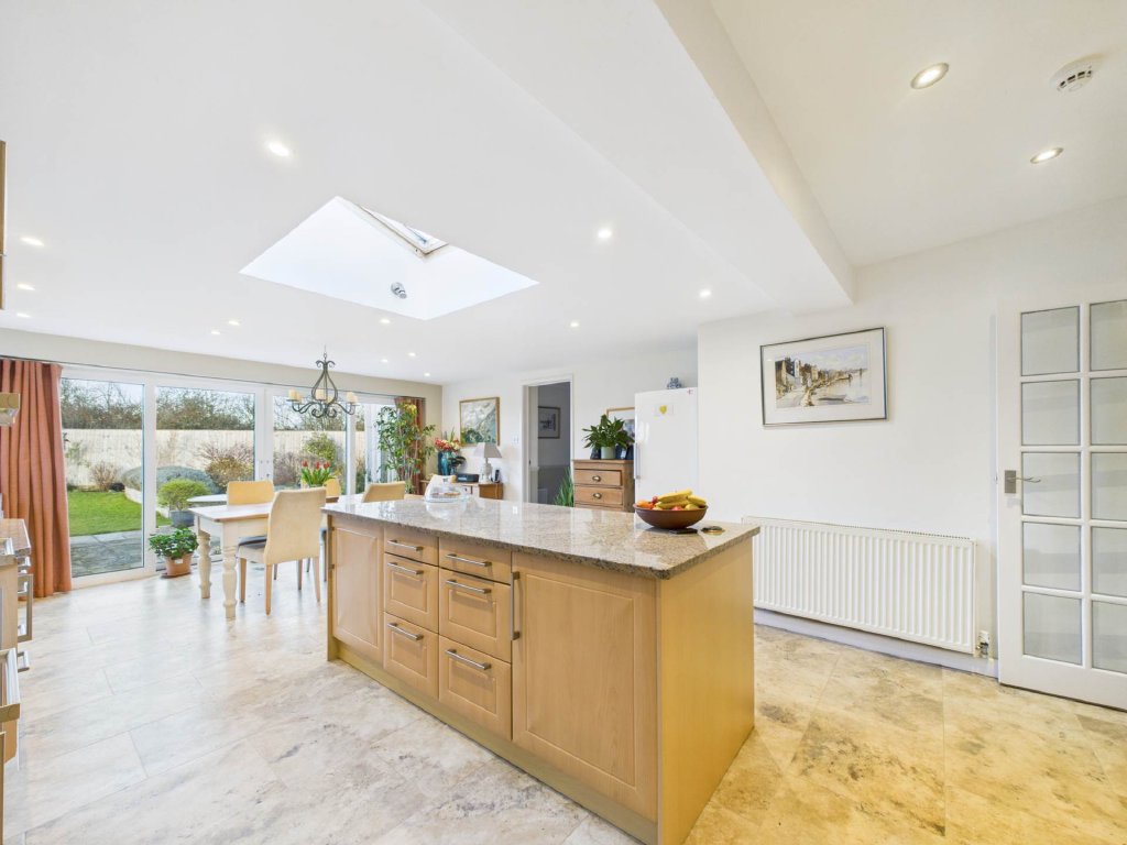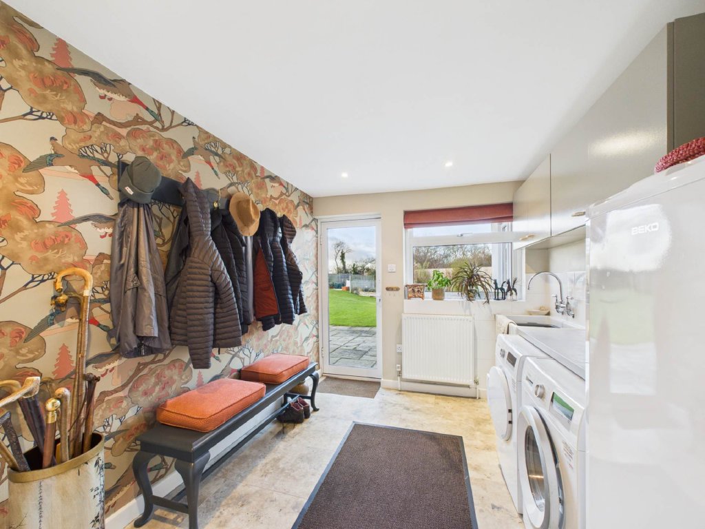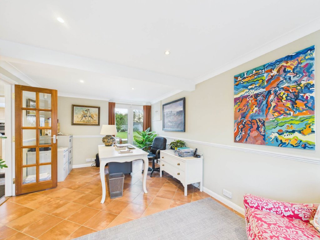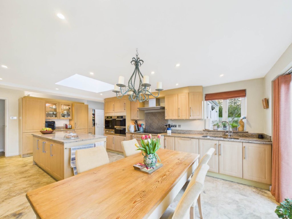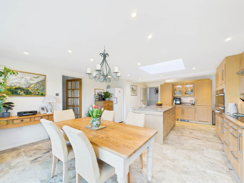 The living room is a true feature of the home, with a multi-level ceiling, a gas fireplace, and large windows that frame the stunning views over the Chiltern Hills. The spacious family kitchen and dining room, complete with a central island, ample storage, and generous worktop space, benefits from floor-to-ceiling windows and doors that open onto the landscaped gardens. Adjacent to the kitchen, a versatile reception room provides space for a home office, formal dining, or children`s playroom, with its own access to the garden. A practical utility room with WC and rear access makes day-to-day living easy, ideal for muddy boots after local walks.
