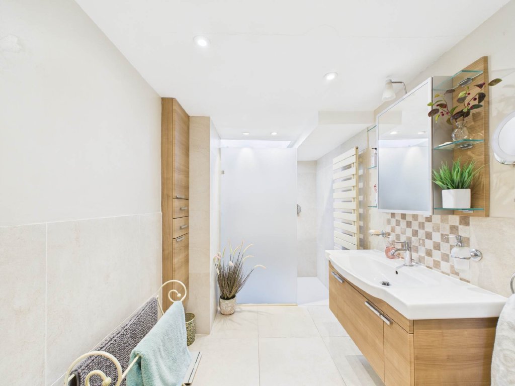 The large entrance hall, brightened by a skylight and flanked by windows alongside the double front doors, leads to two double bedrooms with built-in storage. A third bedroom has double doors that open onto the secluded courtyard, surrounded by raised beds and lavender plants, creating a serene retreat. The family shower room is airy and light, with the skylight positioned over the shower.