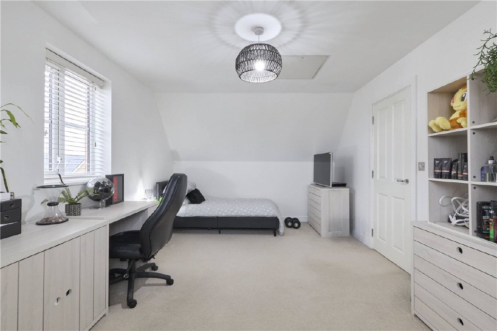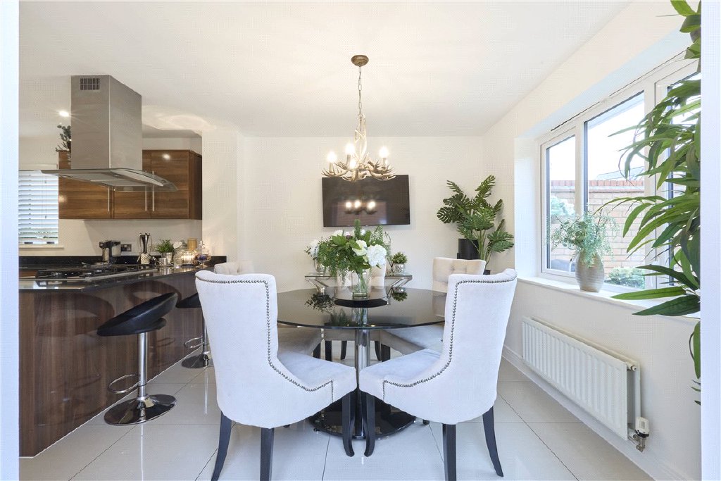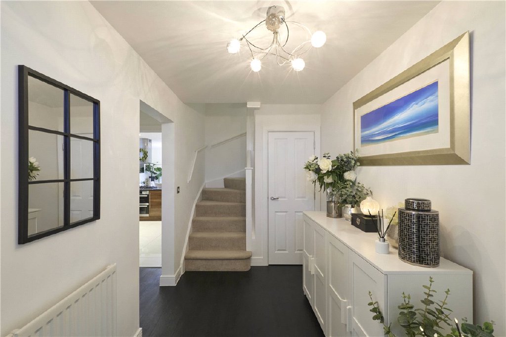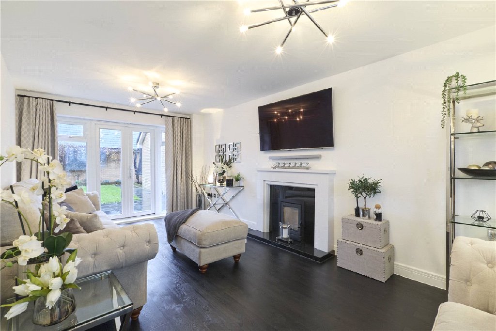 The property is tucked away on the development positioned just opposite a children’s play area with the picturesque background of open fields. There’s a small and established front garden with a driveway beside, that in turn leads to the garage. The rear garden is predominately lawned with a comprehensive paved terrace and a selection of mature shrubs in the raised flower bed.
