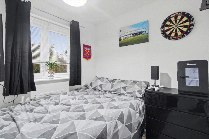 Upstairs, all three bedrooms lead from the landing. Bedrooms two and three have been intelligently re-configured by the sellers to create two well-balanced rooms of similar size, enhancing flexibility for growing families or those needing a dedicated home office. The principal bedroom benefits from a built-in wardrobe and a modern en-suite, while the family bathroom serves the remaining bedrooms.