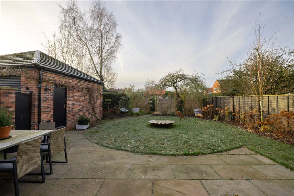 Externally, the property sits proudly on Tollerton's main road. To the front is a gravel driveway providing parking for multiple vehicles, leading to a detached garage. The south-facing rear garden is a major asset, arranged in three distinct sections. At the far end of the garden is a substantial garden room, ideal as a gym, studio or workshop, complete with power and internet connectivity.