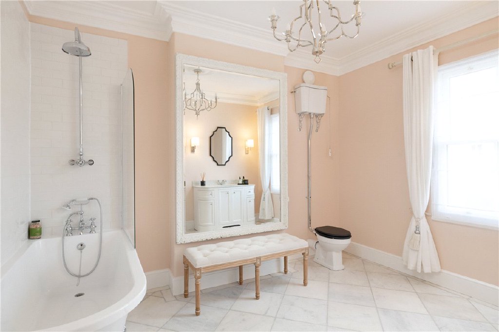 The first floor is anchored by an impressive principal bedroom suite. A standout feature is the dedicated bathroom with a freestanding bath, a concealed door leads through to a dressing room and on to a private en-suite, creating a genuinely luxurious main bedroom arrangement. There is a further bedroom on this level alongside an opulent family bathroom.