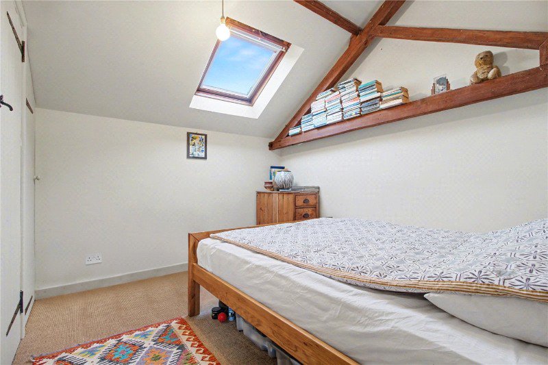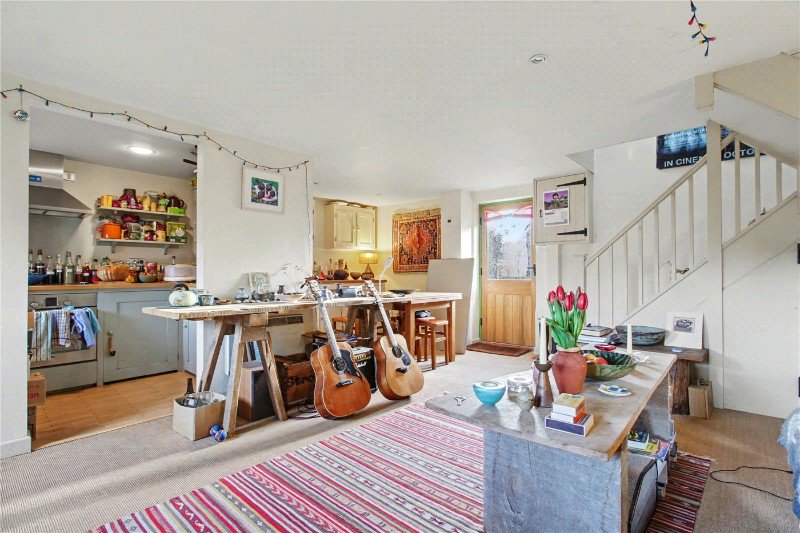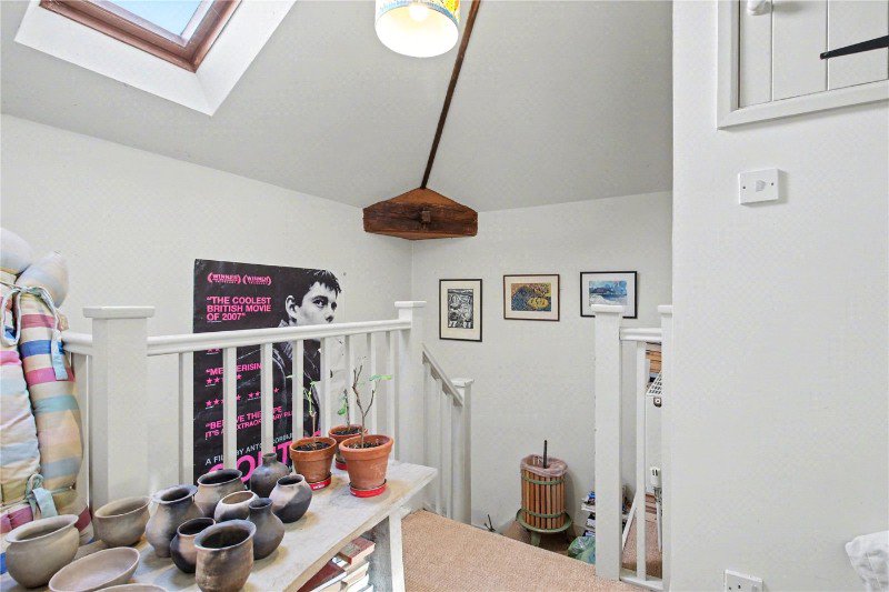 Thoughtful details include a freestanding cast iron log burner and an understairs storage cupboard with doors to both the front and rear, the latter opening directly onto the garden and enhancing the connection between indoors and out.