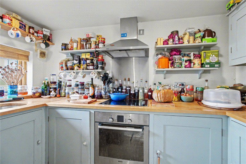 Tucked neatly to one corner of the ground floor, the kitchen is fitted with a range of base and eye-level units complemented by timber work surfaces, with an inset hob and oven providing a practical yet characterful workspace.