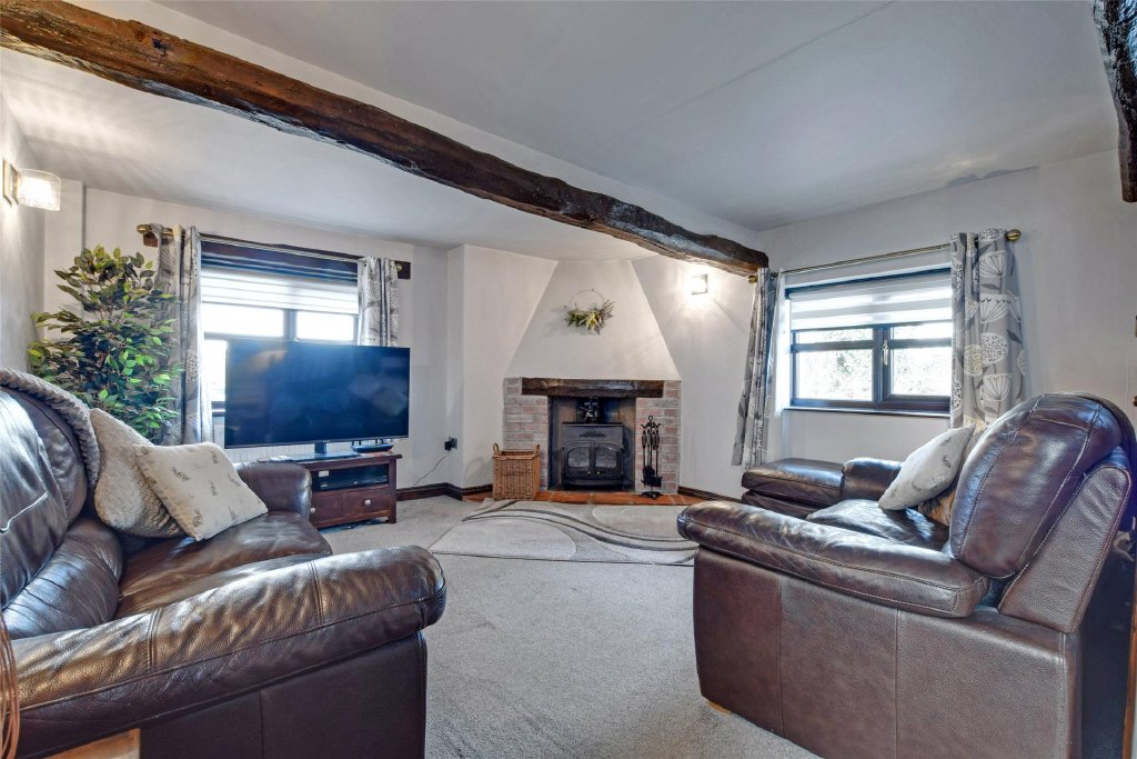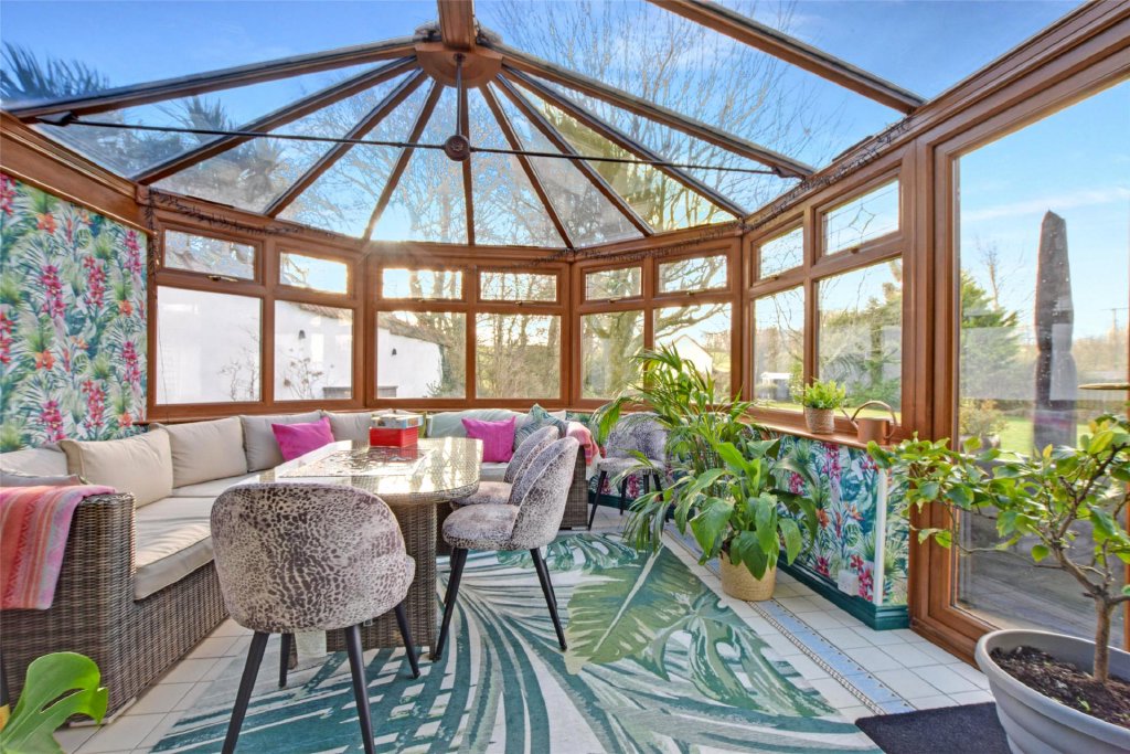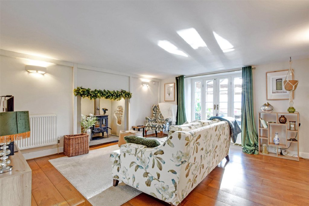 Continuing through to the rear of the house, there is a separate lounge with woodburning stove, again impeccably presented and redecorated, offering a cosy retreat away from the main entertaining space. Double doors lead from here into a large conservatory, perfectly positioned to enjoy views over the rear garden. With double doors opening directly outside, this space becomes a true extension of the home—ideal for summer dining, a reading room, or simply enjoying the peace of the setting year-round.