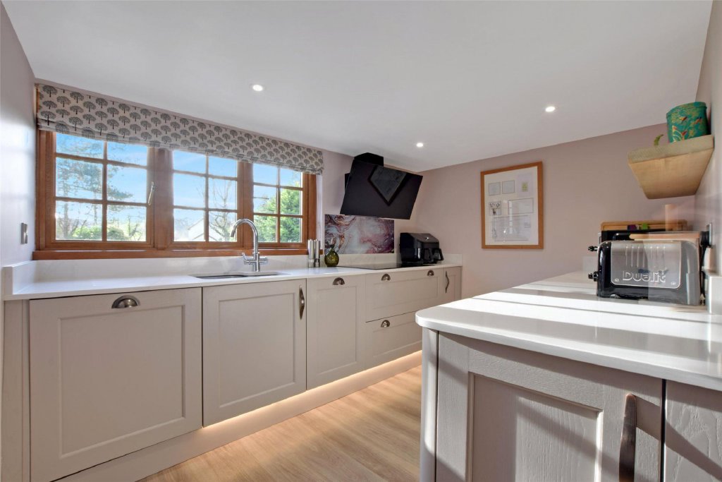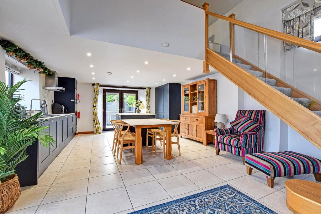 The main entrance door opens into a bright open-plan living and kitchen space. To the left, the living area is dual aspect and centred around an attractive wood-burning stove, creating a warm, cosy atmosphere that works beautifully in all seasons. To the right-hand side, the kitchen/dining area has been recently fitted, with a tasteful, high-quality finish and a layout designed for comfort and convenience. A downstairs cloakroom completes the ground floor.
