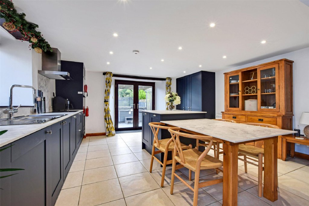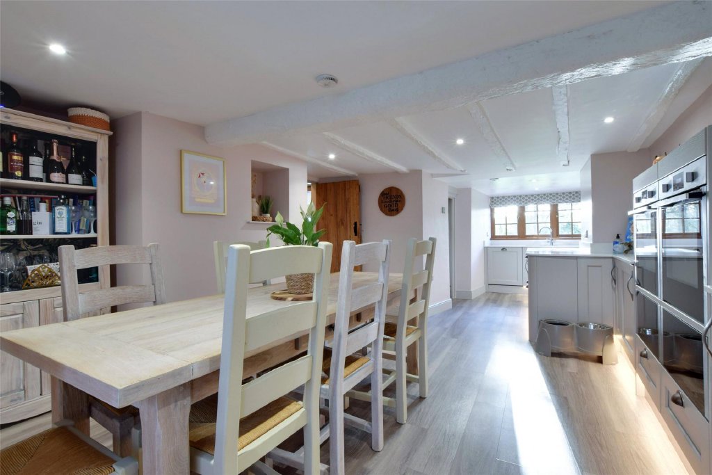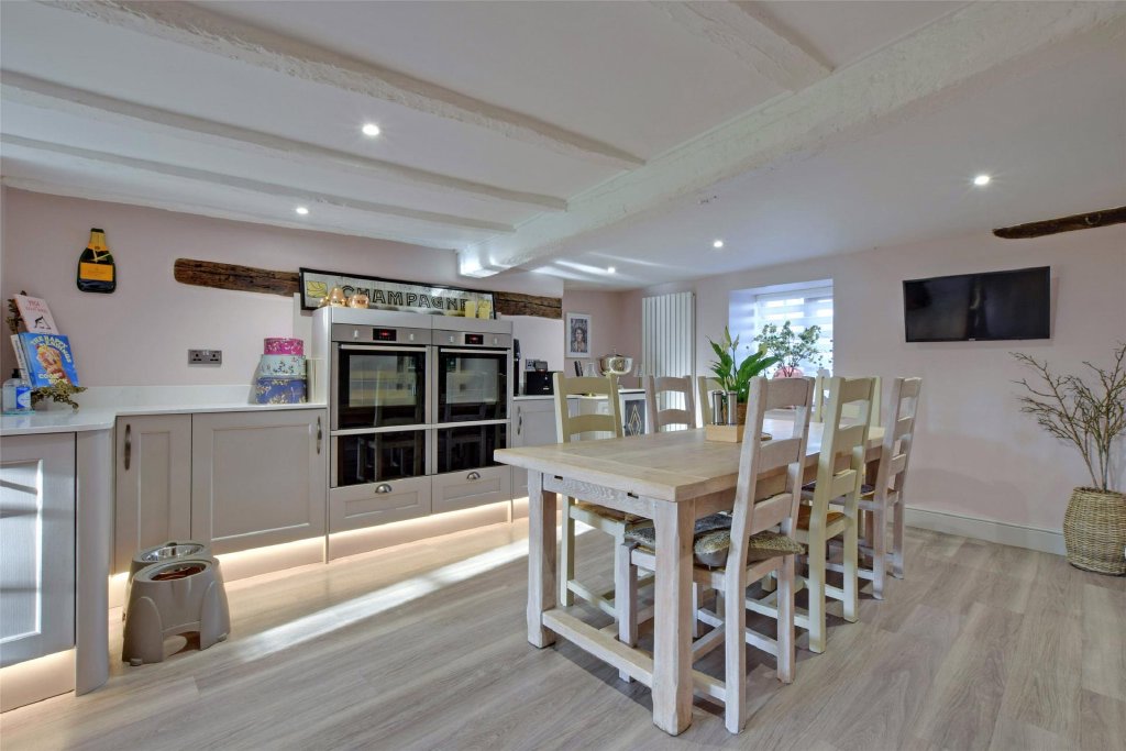 To the right-hand side, the property opens into a stunning modernised kitchen/dining room, designed with both style and practicality in mind. Dual aspect and filled with natural light, it features exceptional cabinetry and a quality range of integrated appliances including two eye-level Neff Slide and Hide ovens, integrated dishwasher, five-ring induction hob, 1.5 bowl sink, and a large larder cupboard providing excellent storage and an American fridge/freezer. It is a room that feels purpose-built for gathering—whether that’s family breakfasts, relaxed suppers, or hosting friends in true farmhouse style, yet with all the sleekness of a contemporary home.