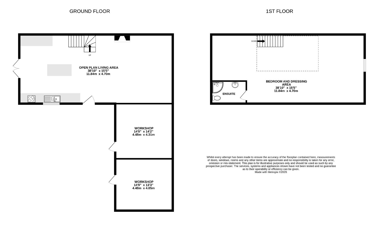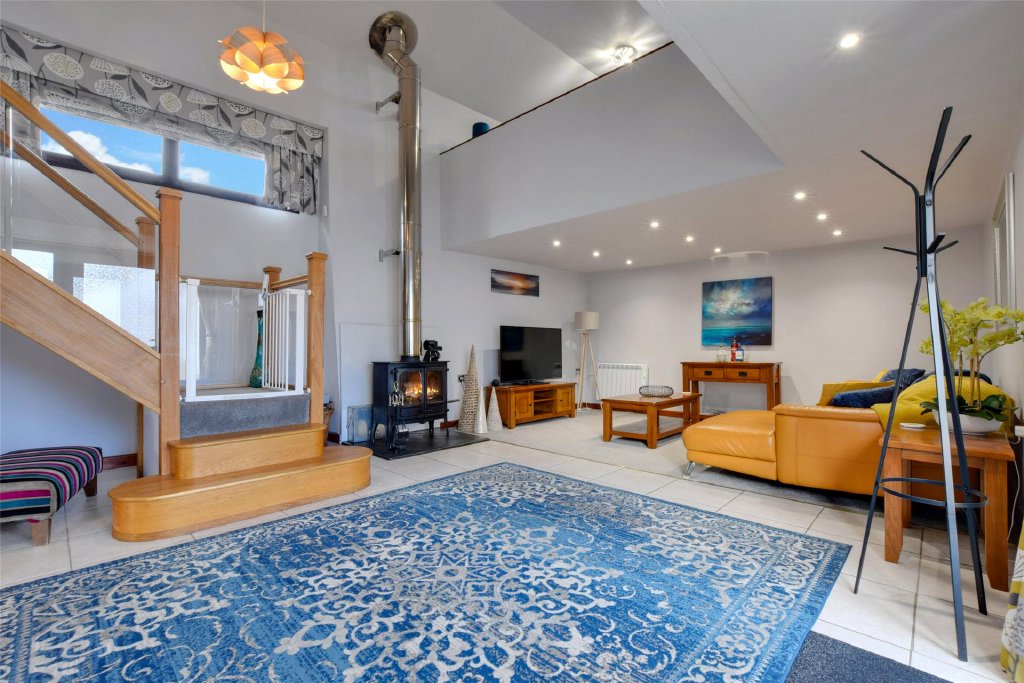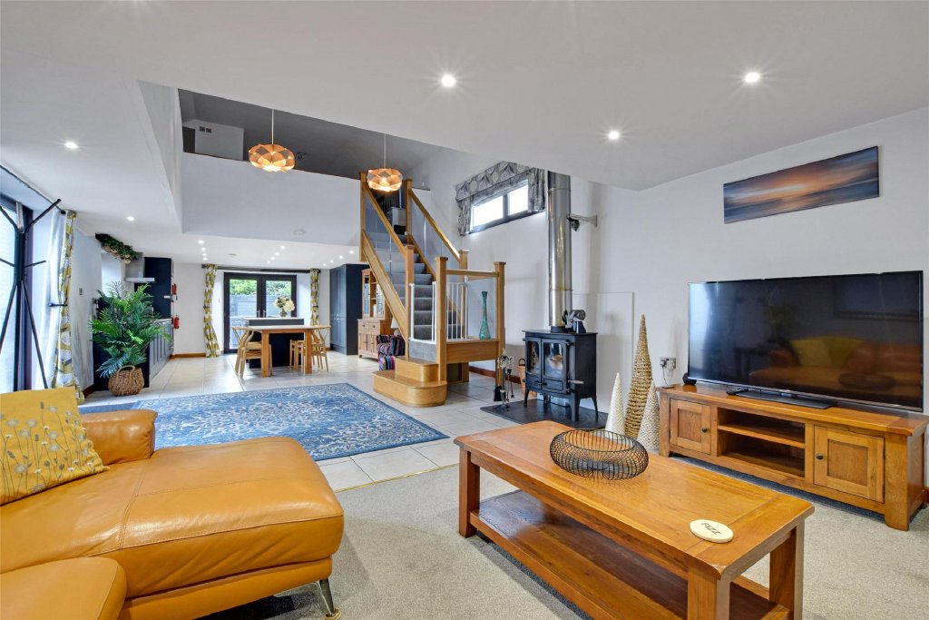 To the right-hand side, the living area enjoys an attractive wood-burning stove, while a striking glass staircase rises to a first-floor open-plan landing, incorporating a dressing area, a recently fitted three-piece shower room with a single shower cubicle, and a well-proportioned double bedroom space.