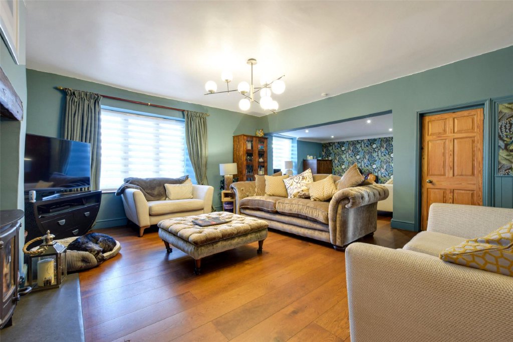 To the left-hand side of the hallway is an impressive sitting room/dining room, stretching to almost 30 feet in length. A wonderfully versatile room, it offers superb scale for entertaining and relaxed family life alike, anchored by a striking wood-burning stove set on a slate hearth—a beautiful focal point that brings warmth and atmosphere through the seasons.