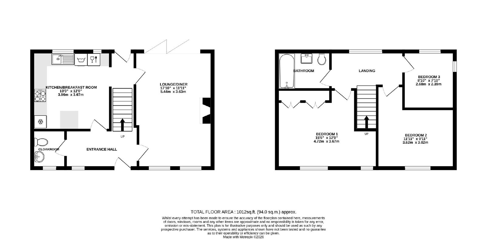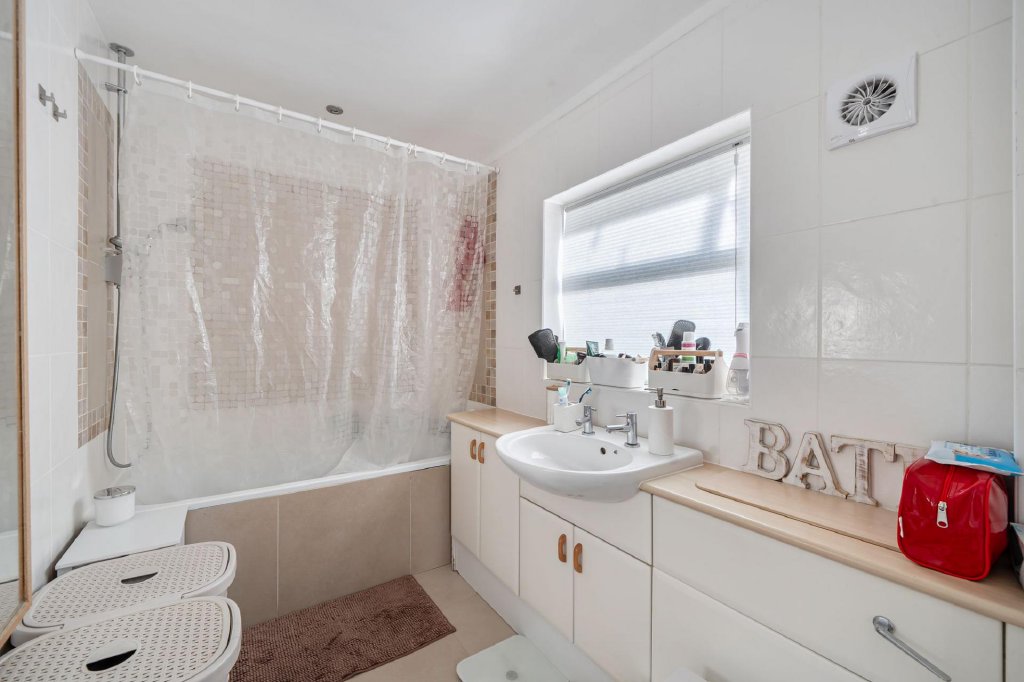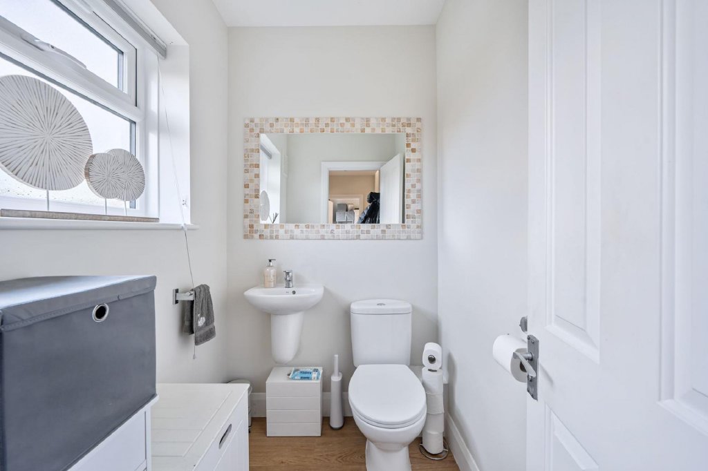 The property, having been comprehensively updated and modernised by the current owners, is approached via a good size front garden, offering potential to create off road parking if required, but rest assured this quiet location offers excellent road parking for numerous cars. Internally, the accommodation is well arranged and filled with natural light, with many of the rooms being double aspect, providing a comfortable and versatile living environment suitable for a range of buyers, from families, first time buyers or downsizers. Approached via a spacious entrance hall with useful downstairs cloakroom. The double aspect lounge has an open fire and recently fitted bifolding doors to the rear terrace, as well as a window overlooking the front garden. The fully fitted kitchen/breakfast room has pleasant views over the rear garden and offers a range of grey fronted units incorporating gas hob and electric oven, integrated fridge and freezer units, and space and plumbing for washing machine dishwasher. There is also a breakfast bar. Rising to the first floor, the spacious landing has three bedrooms off, with the principle bedroom offering fitted wardrobes. The family bathroom consists of a bath with shower over, wc and vanity unit.
