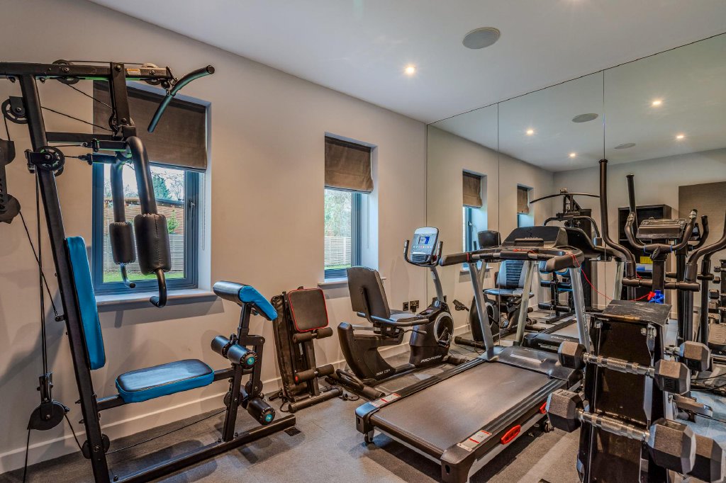 Leading from the kitchen towards the garage is an inner hallway providing access to a home office (currently being used as a gymnasium), WC, a practical utility room and boiler/utilities room, creating a well-planned and highly functional family hub. The integral double garage is equipped with electric doors and has been thoughtfully fitted with practical built-in storage, enhancing everyday convenience.