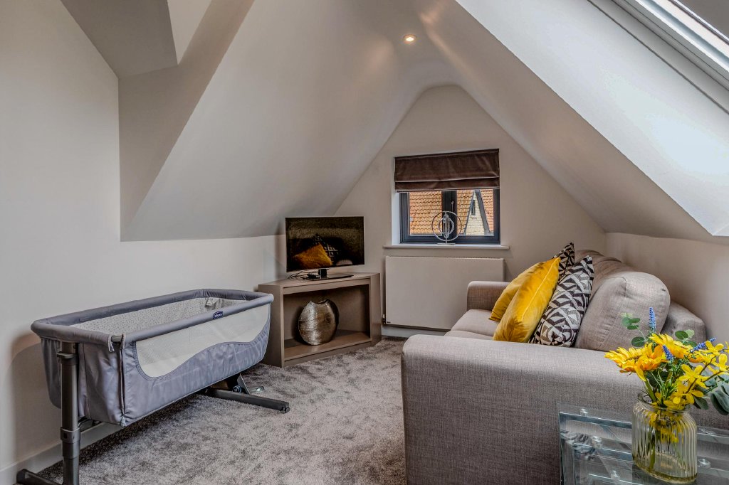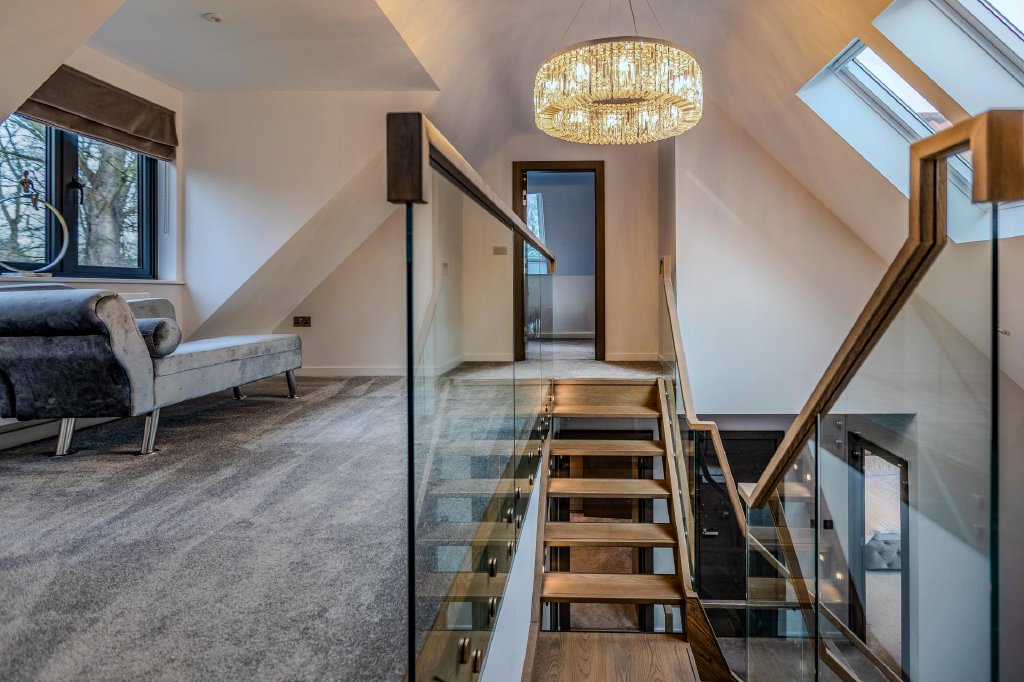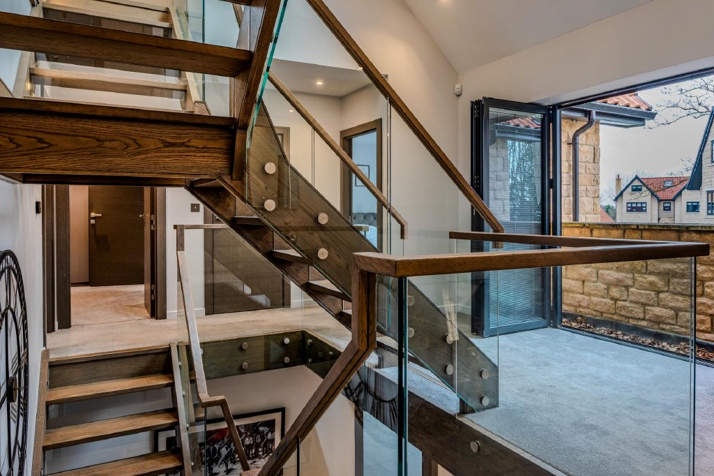 The impressive modern staircase, with its striking architectural presence, continues to the second floor which accommodates a further two well-proportioned bedrooms, providing additional flexible living space.