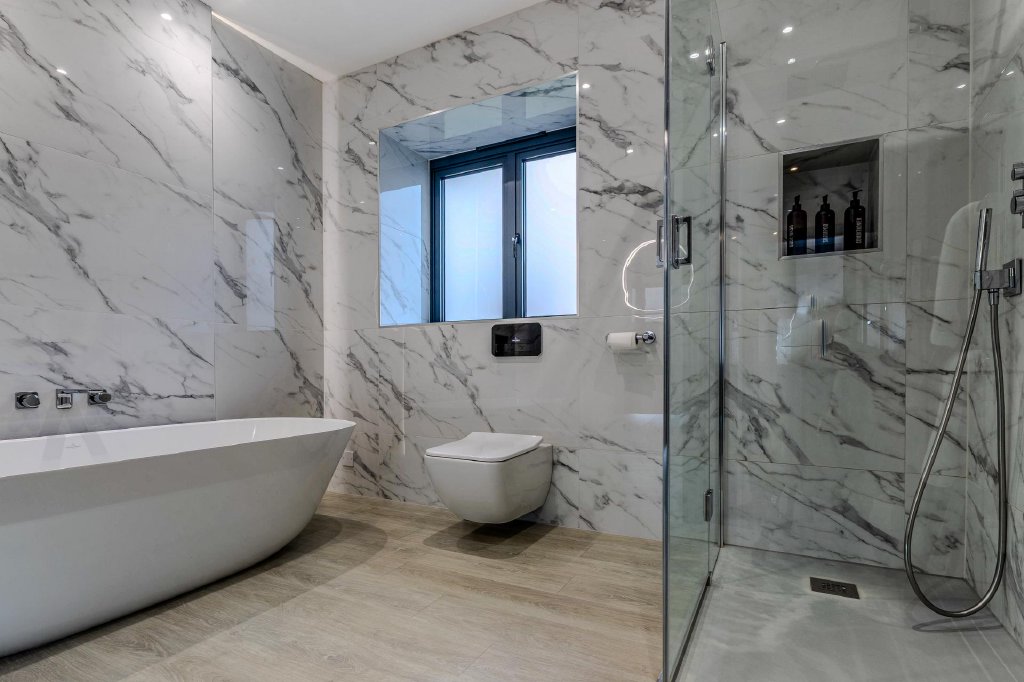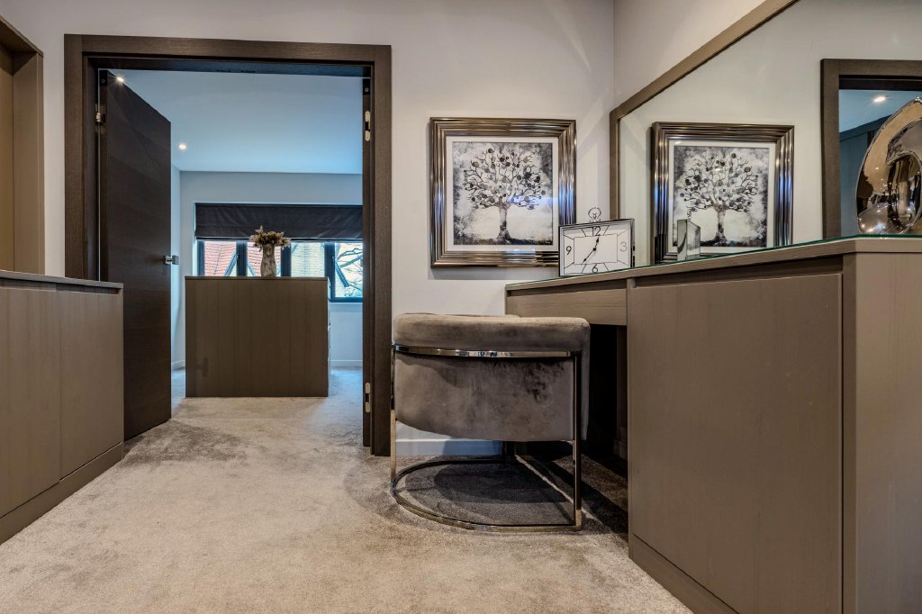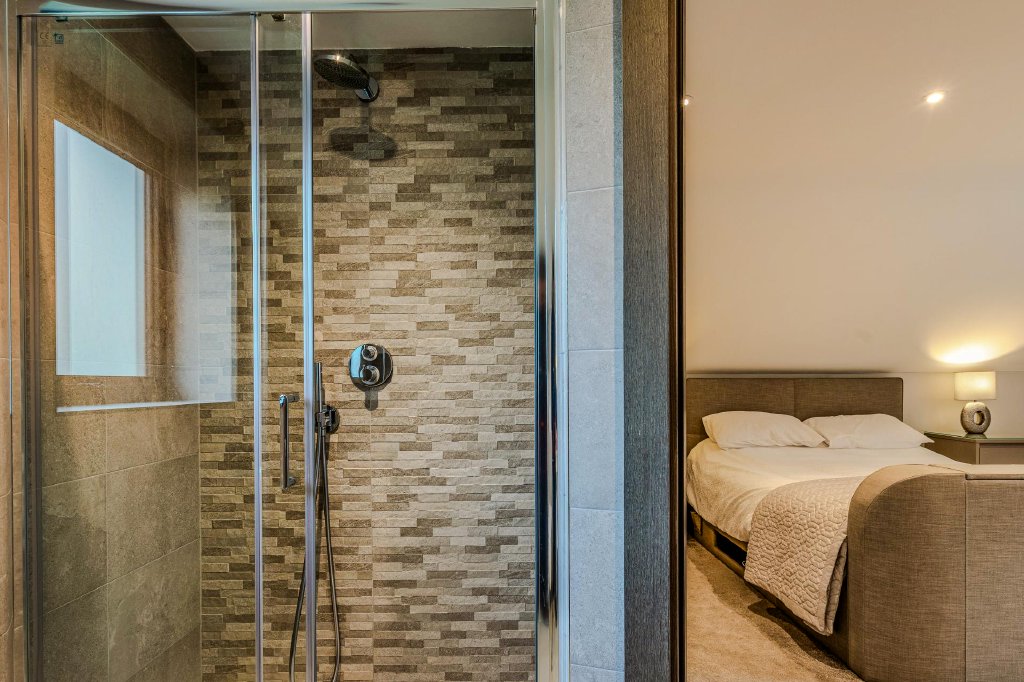 Each of the beautifully appointed bedrooms is enhanced by bespoke fitted wardrobes with discreetly integrated mini-refrigerators, expertly crafted to provide elegant storage while maintaining a refined, clutter-free aesthetic