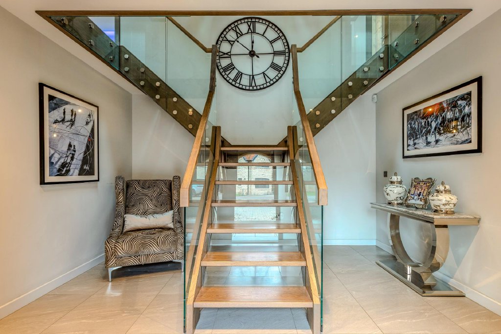 The property is introduced by a welcoming entrance opening into a light and spacious hallway, featuring a striking central staircase with elegant glass balustrading that sets the tone for the modern yet sophisticated interior. The hallway flows seamlessly into the heart of the home – a light and spacious kitchen which exudes luxury, featuring top-of-the-range integrated appliances, a striking central island for more casual dining and beautifully crafted storage that perfectly combines sophistication with everyday practicality. A
