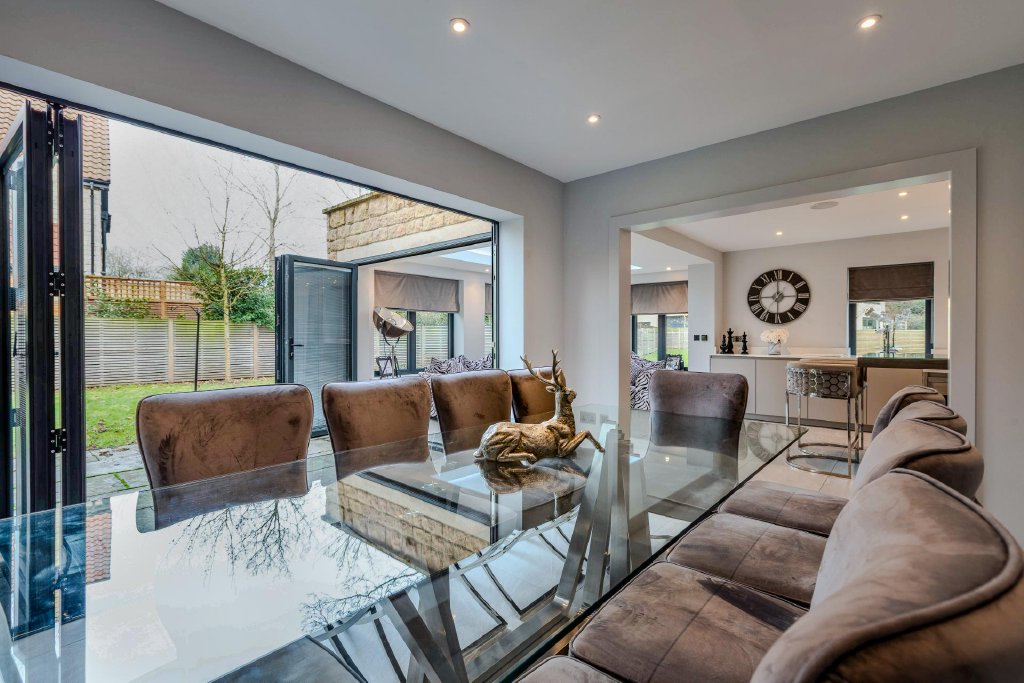 Aluminium bi-folding doors from the open-plan orangery open directly onto the beautiful gardens, seamlessly connecting the indoor living space with the outdoor setting. Adjoining the kitchen is also a generous formal dining space, beautifully enhanced by bi-folding doors that also open directly onto the rear gardens, creating a refined setting for both intimate dinners and grand entertaining.
