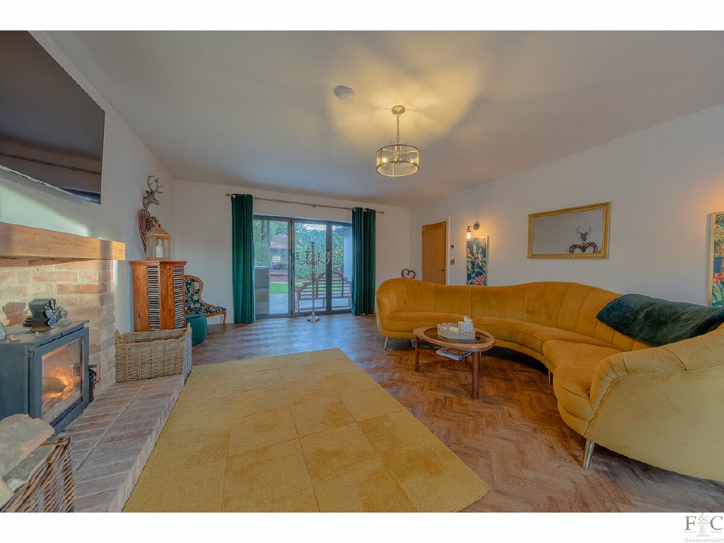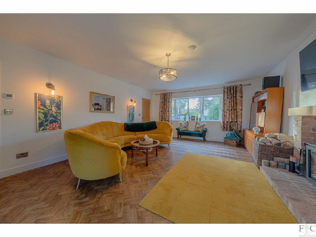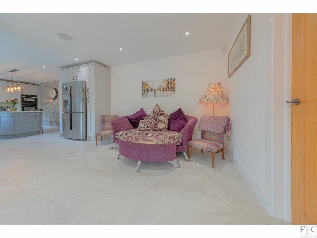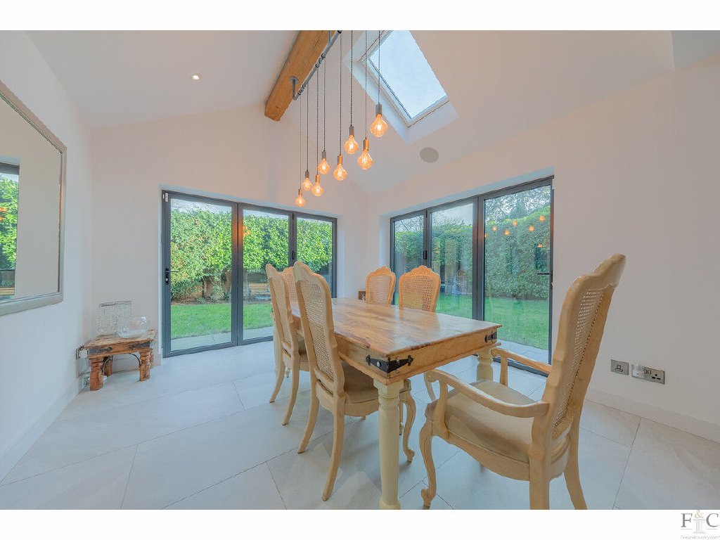 Presently used as a games room, the first reception room is at the front of the house and leads to a large lounge, then through to the dining area linked to the kitchen, and back to the entrance hall. A secluded garden and outside patio can be accessed through three bi-folding doors that merge the indoor and outdoor entertainment spaces of the property, providing a versatile and inclusive arrangement for entertaining.