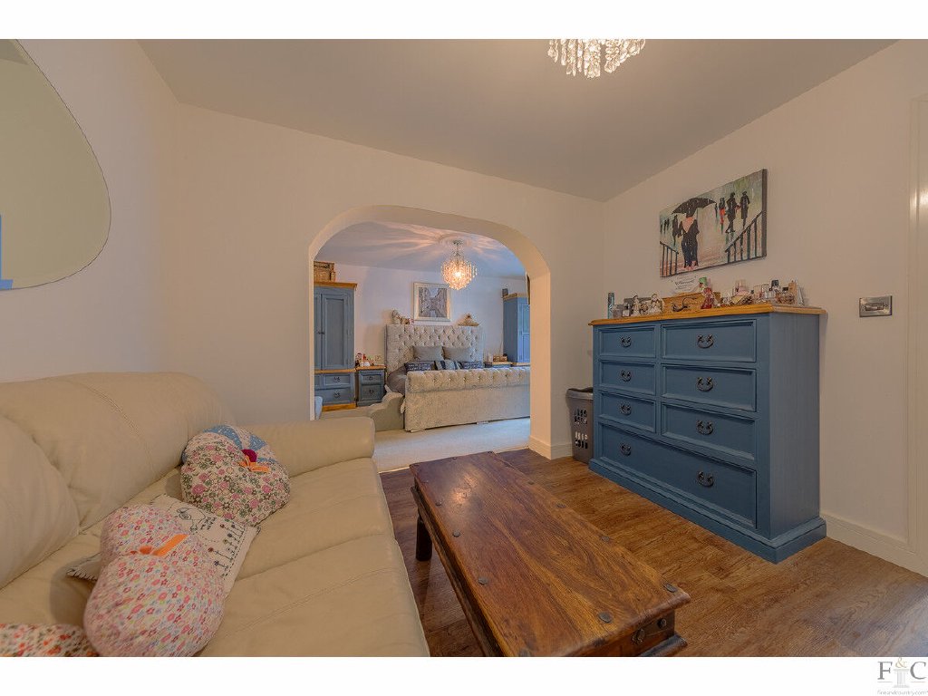 The living room is the width of the property and has a multi-fuelled burner. A rustic mantel shelf and brick hearth create a central focal point and with dual aspect windows, parquet wood effect LVT flooring and music drifting in from the Sonos speakers wired into the kitchen, dining area and garden, the room is a haven for relaxation.