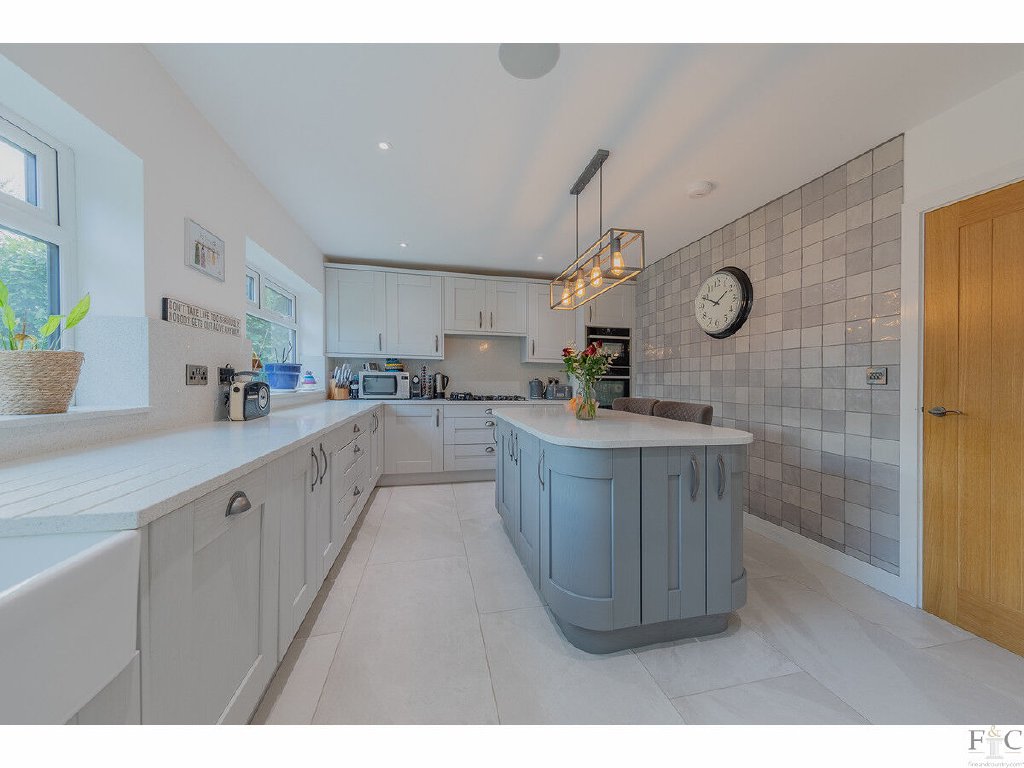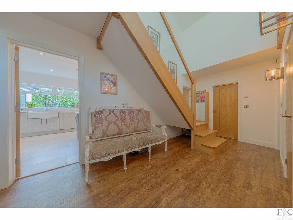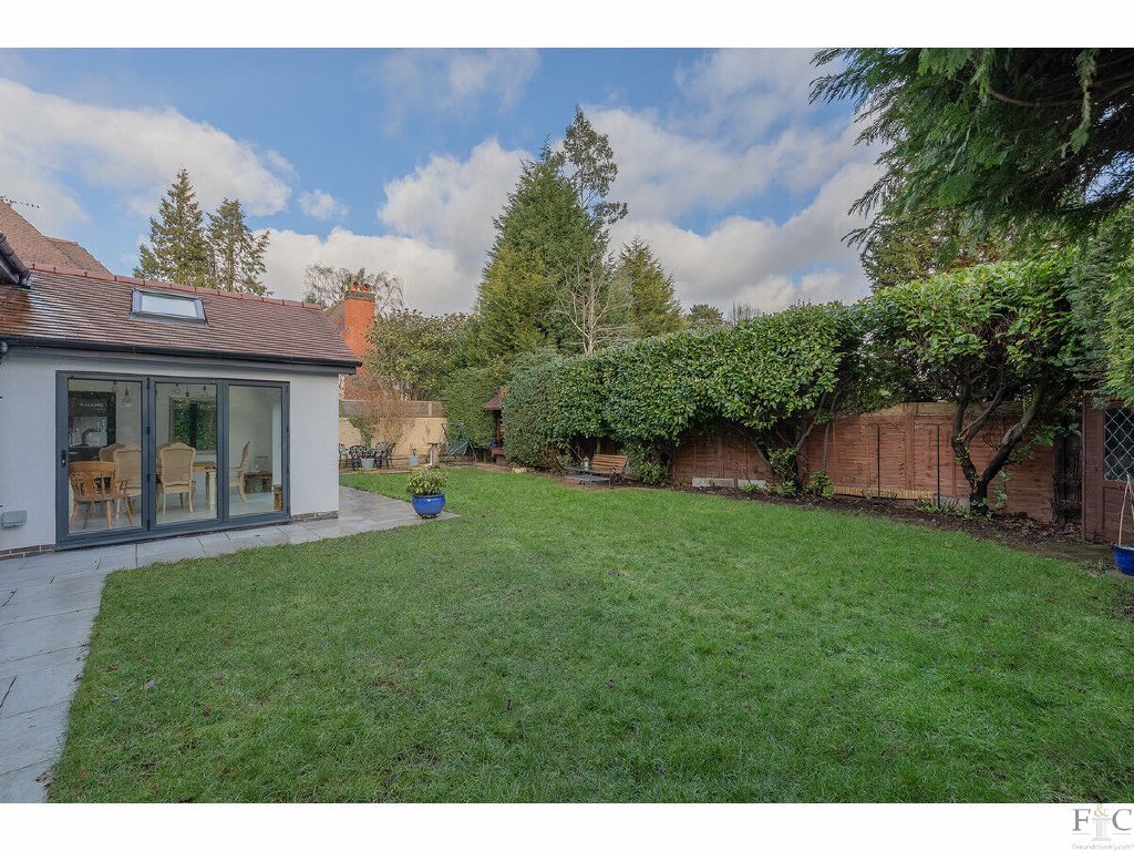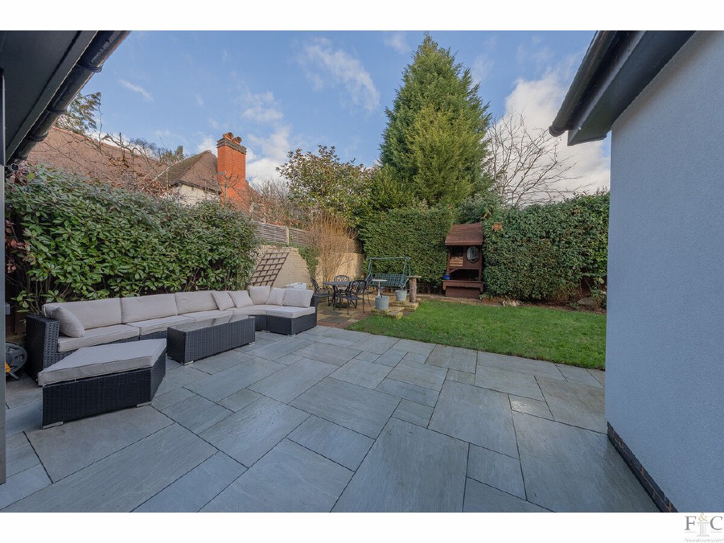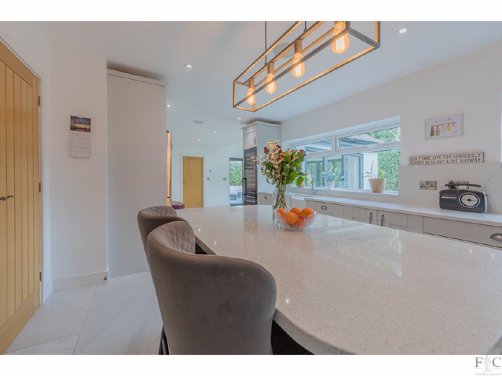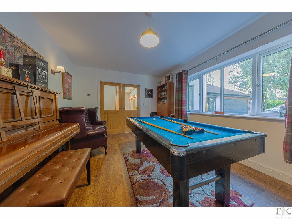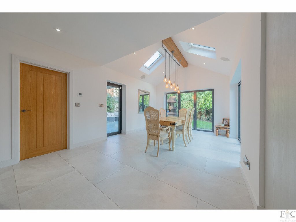 Presently used as a games room, the first reception room is at the front of the house and leads to a large lounge, then through to the dining area linked to the kitchen, and back to the entrance hall. A secluded garden and outside patio can be accessed through three bi-folding doors that merge the indoor and outdoor entertainment spaces of the property, providing a versatile and inclusive arrangement for entertaining.