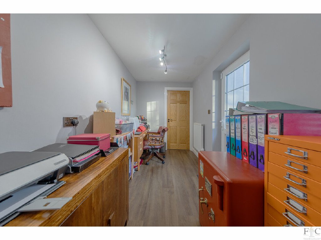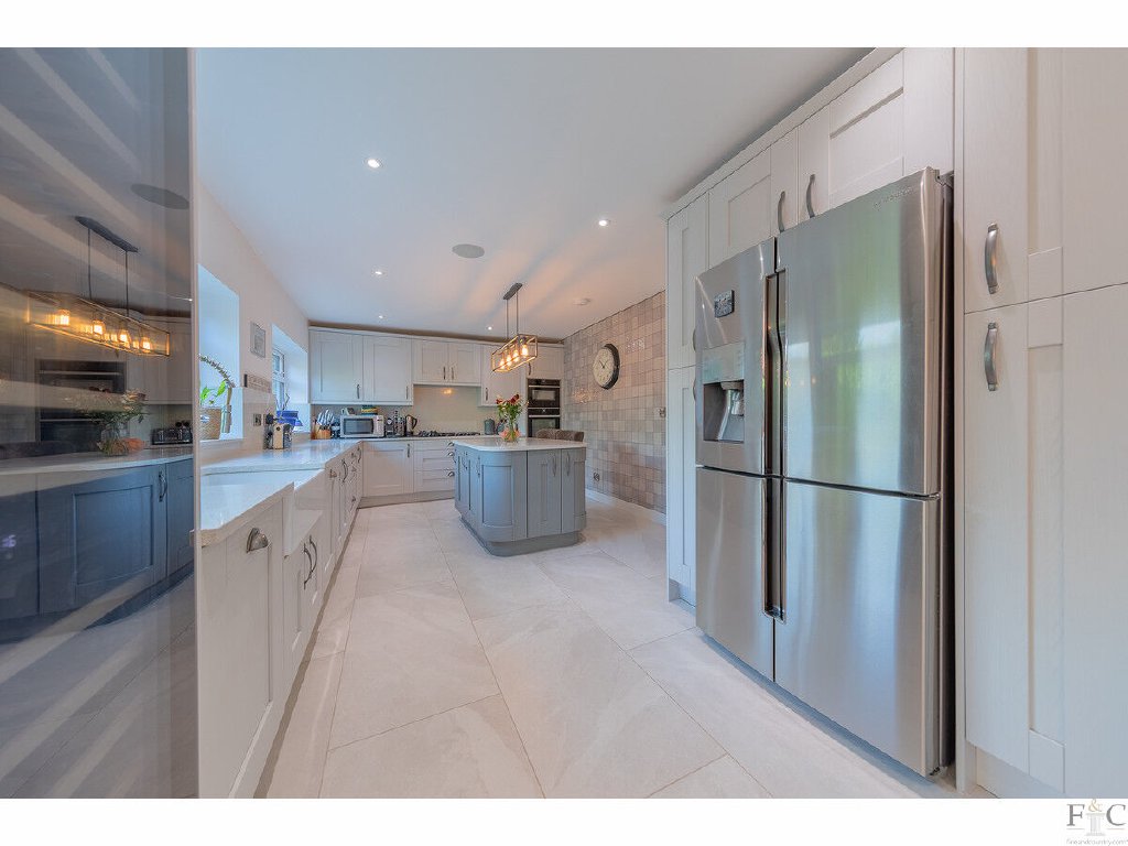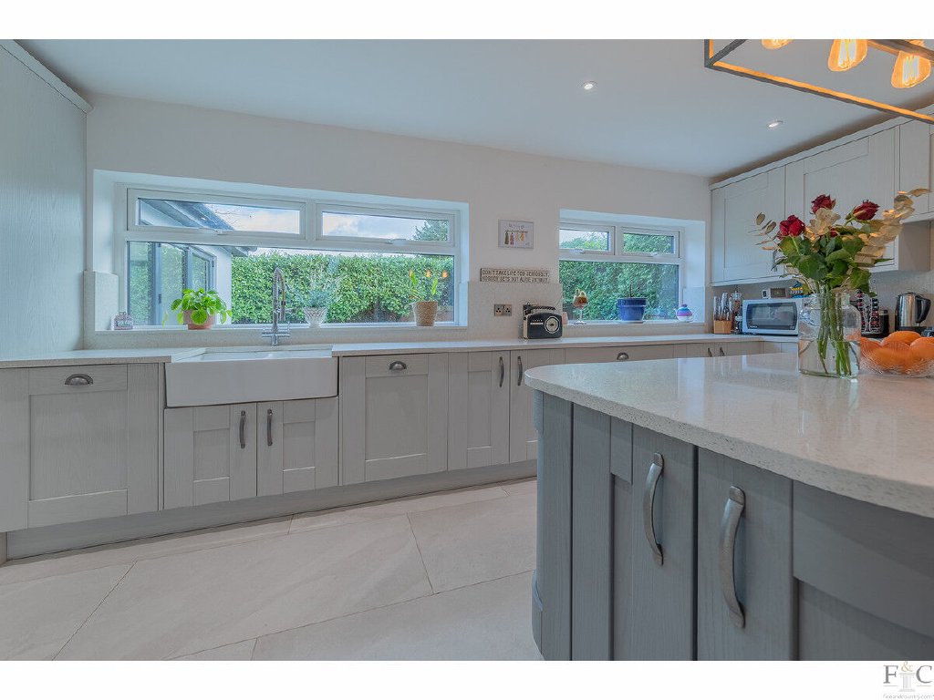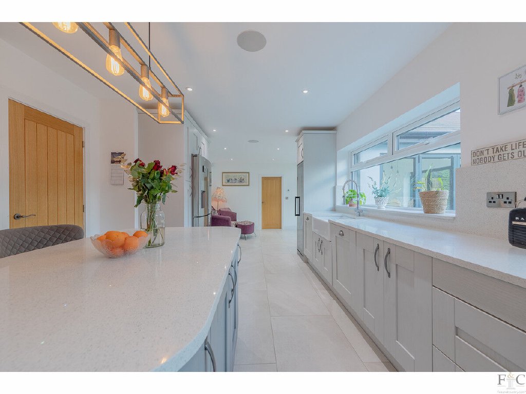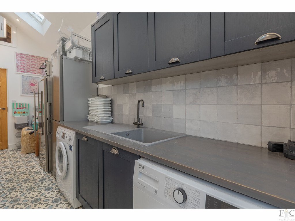 The kitchen and dining room are stylishly designed. Shaker style grey fitted floor and wall units are across two walls, providing ample preparation surfaces and circling a central island unit. Neff appliances were newly fitted in 2022 and those included in the sale are a hob, extractor hood, oven and dishwasher. Other items such as the wine and American style fridge can be negotiated for inclusion. A white butler sink, tiling and pendant light fitment create a delightful central hub, and it seamlessly merges into the dining area. Here, a vaulted ceiling, electrically operated Velux windows and Sonos speakers create a wonderful space for formal or informal meals. Curtains, fitments and light fittings can be negotiated over in the sale of the property.