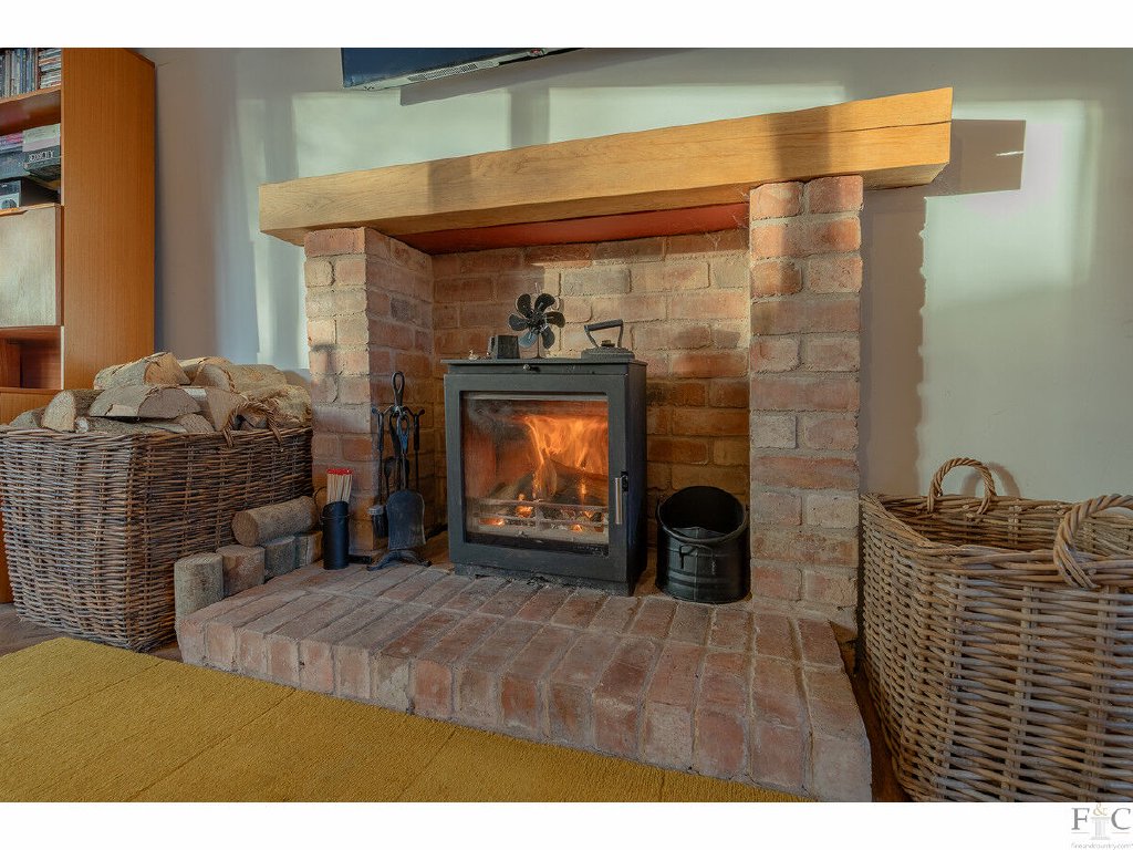 The living room is the width of the property and has a multi-fuelled burner. A rustic mantel shelf and brick hearth create a central focal point and with dual aspect windows, parquet wood effect LVT flooring and music drifting in from the Sonos speakers wired into the kitchen, dining area and garden, the room is a haven for relaxation.